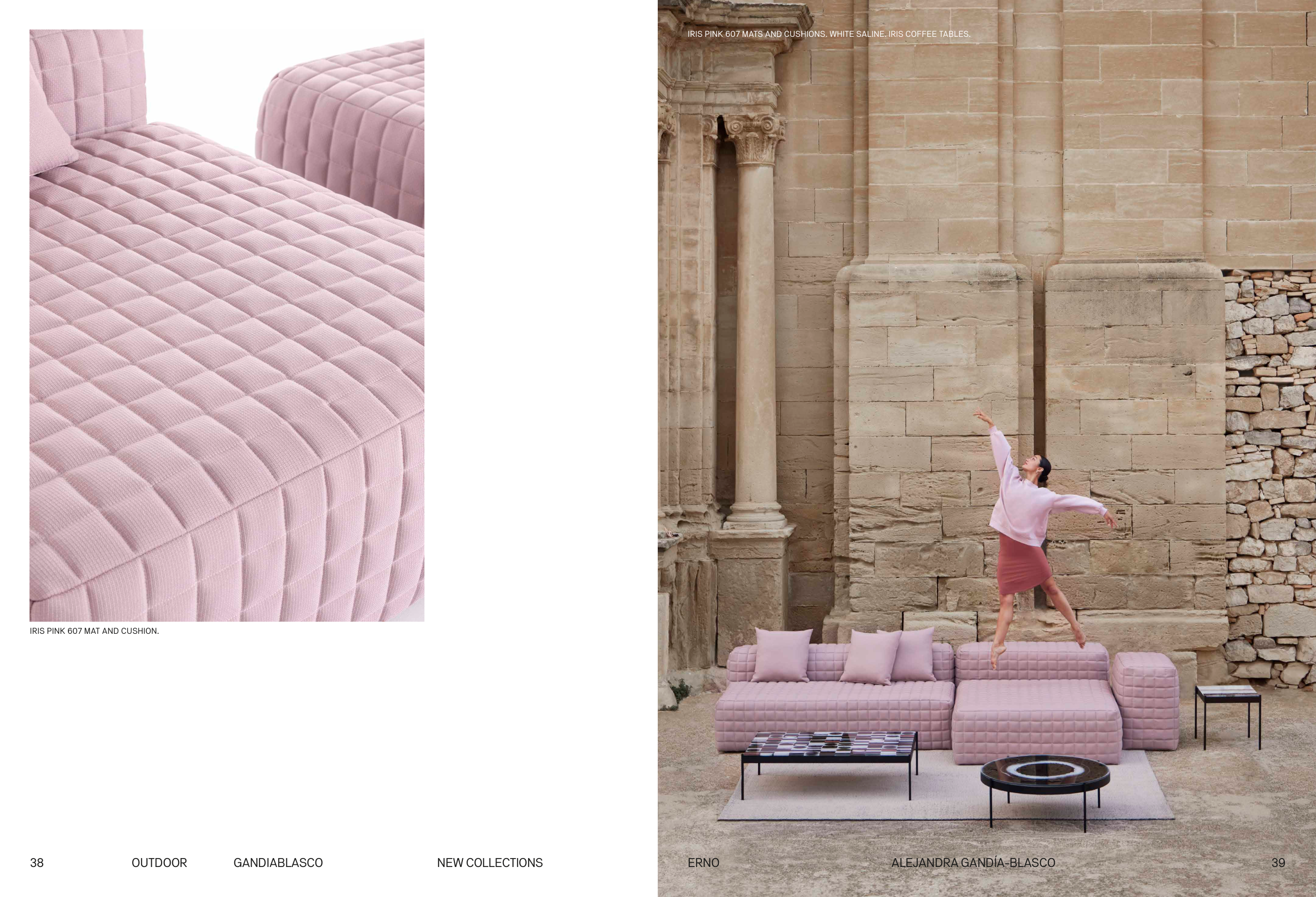 IRIS PINK 607 MATS AND CUSHIONS. WHITE SALINE. IRIS COFFEE TABLES.