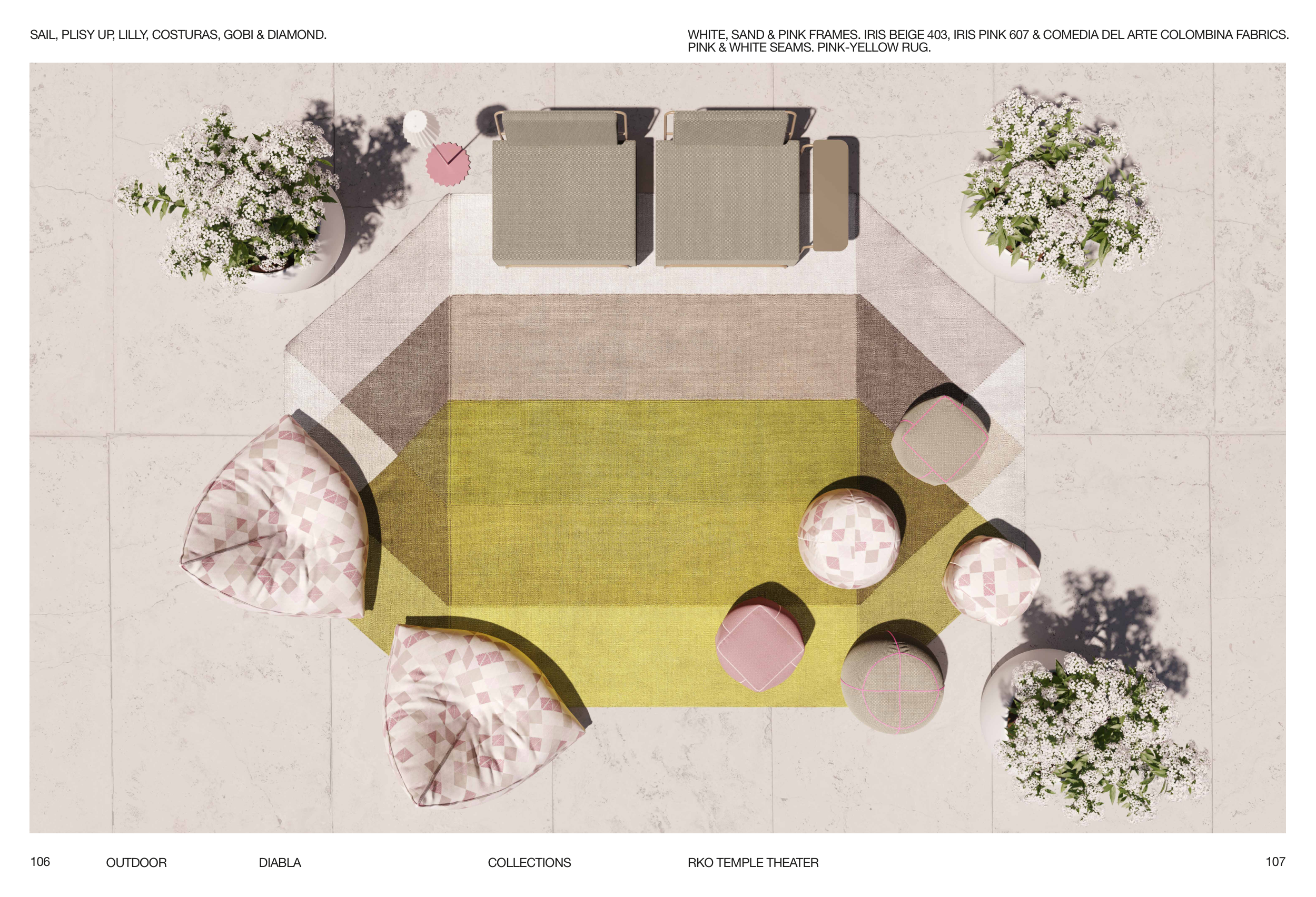 WHITE, SAND & PINK FRAMES. IRIS BEIGE 403, IRIS PINK 607 & COMEDIA DEL ARTE COLOMBINA FABRICS.