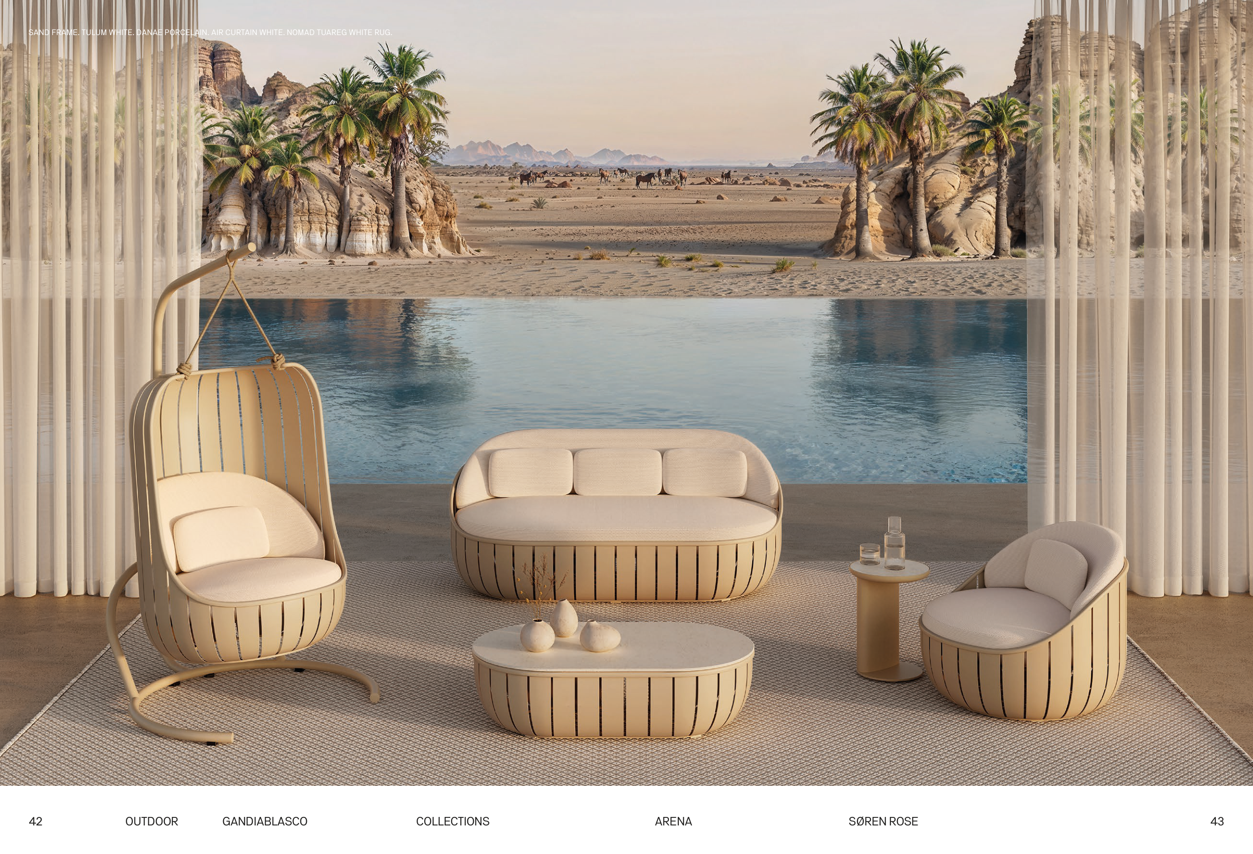 SAND FRAME. TULUM WHITE. DANAE PORCELAIN. AIR CURTAIN WHITE. NOMAD TUAREG WHITE RUG.
