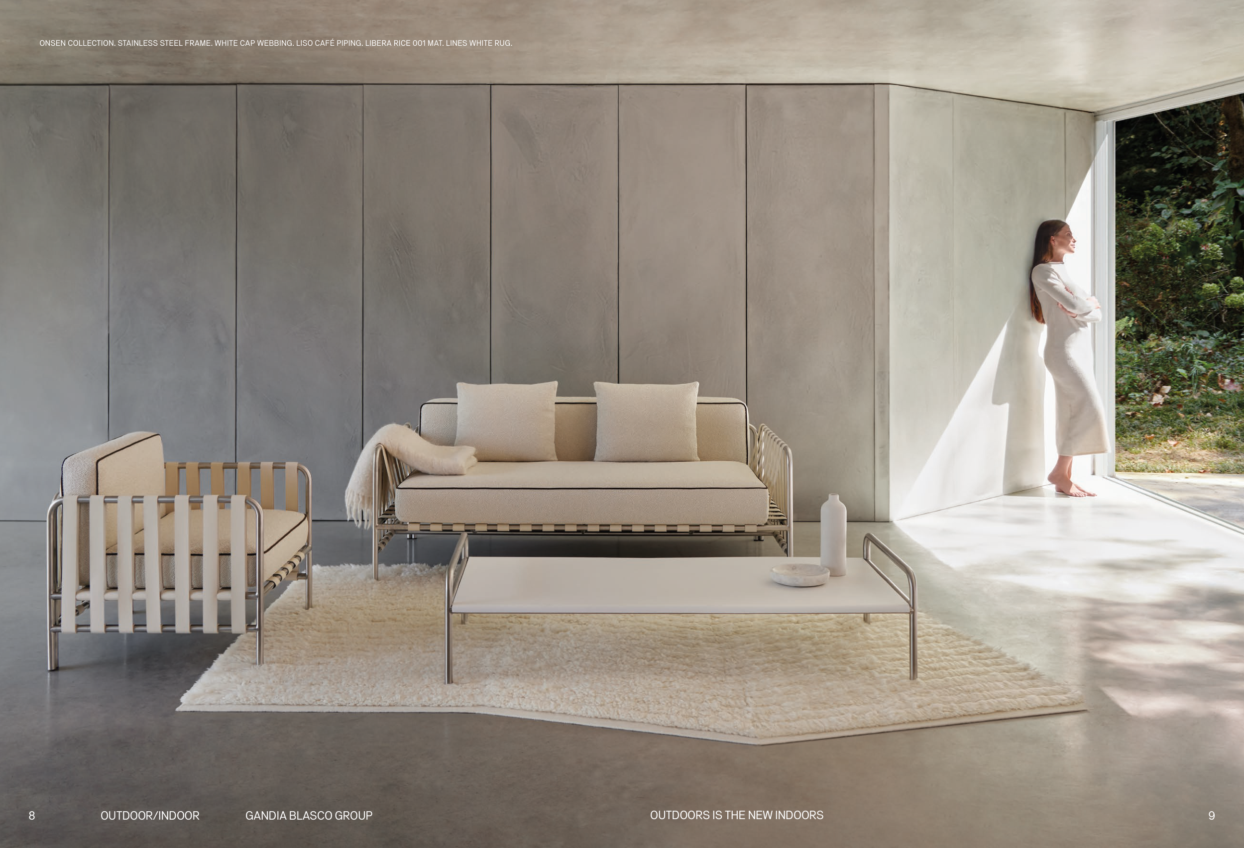 ONSEN COLLECTION. STAINLESS STEEL FRAME. WHITE CAP WEBBING. LISO CAFÉ PIPING. LIBERA RICE 001 MAT. LINES WHITE RUG.