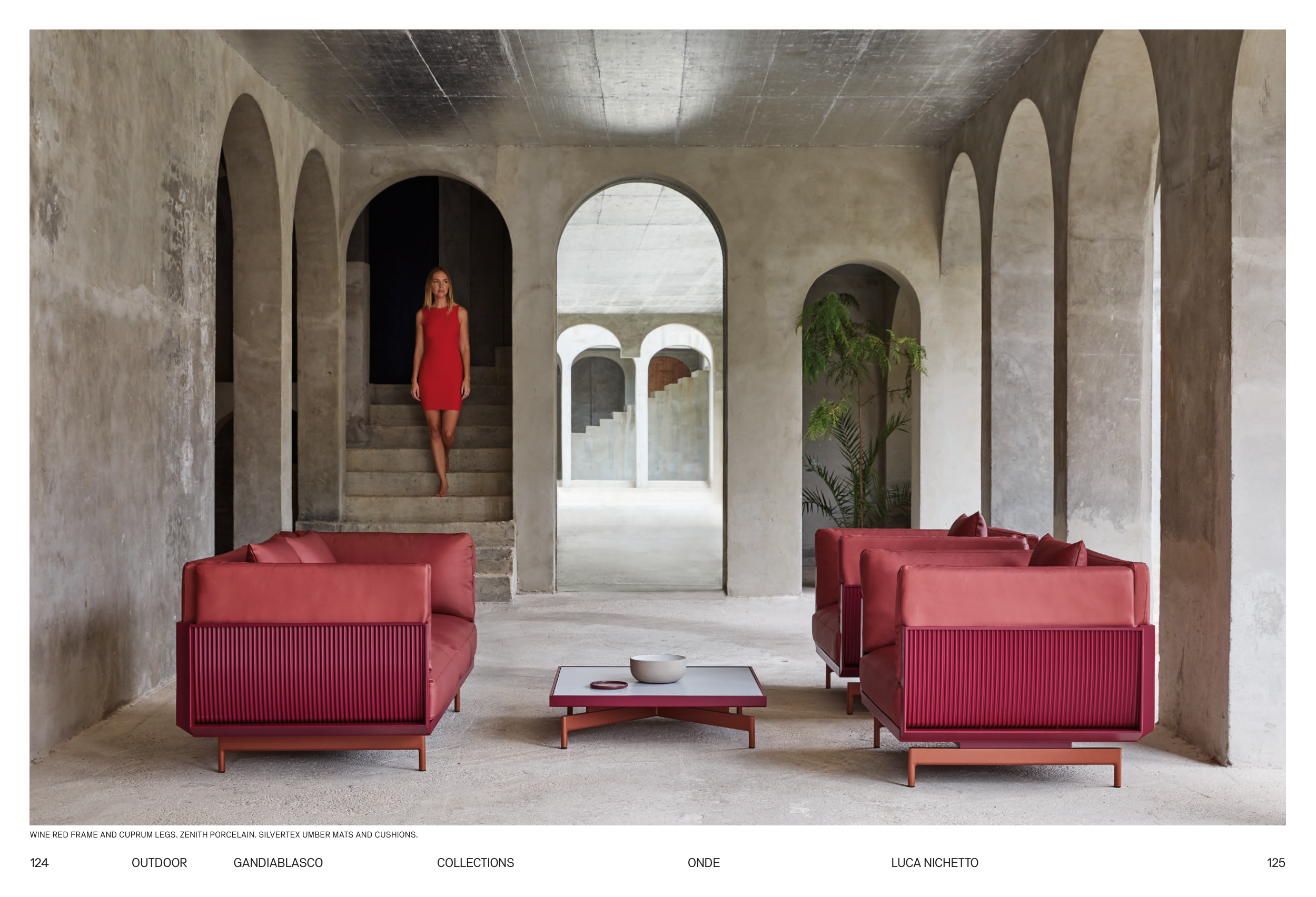 WINE RED FRAME AND CUPRUM LEGS. ZENITH PORCELAIN. SILVERTEX UMBER MATS AND CUSHIONS.