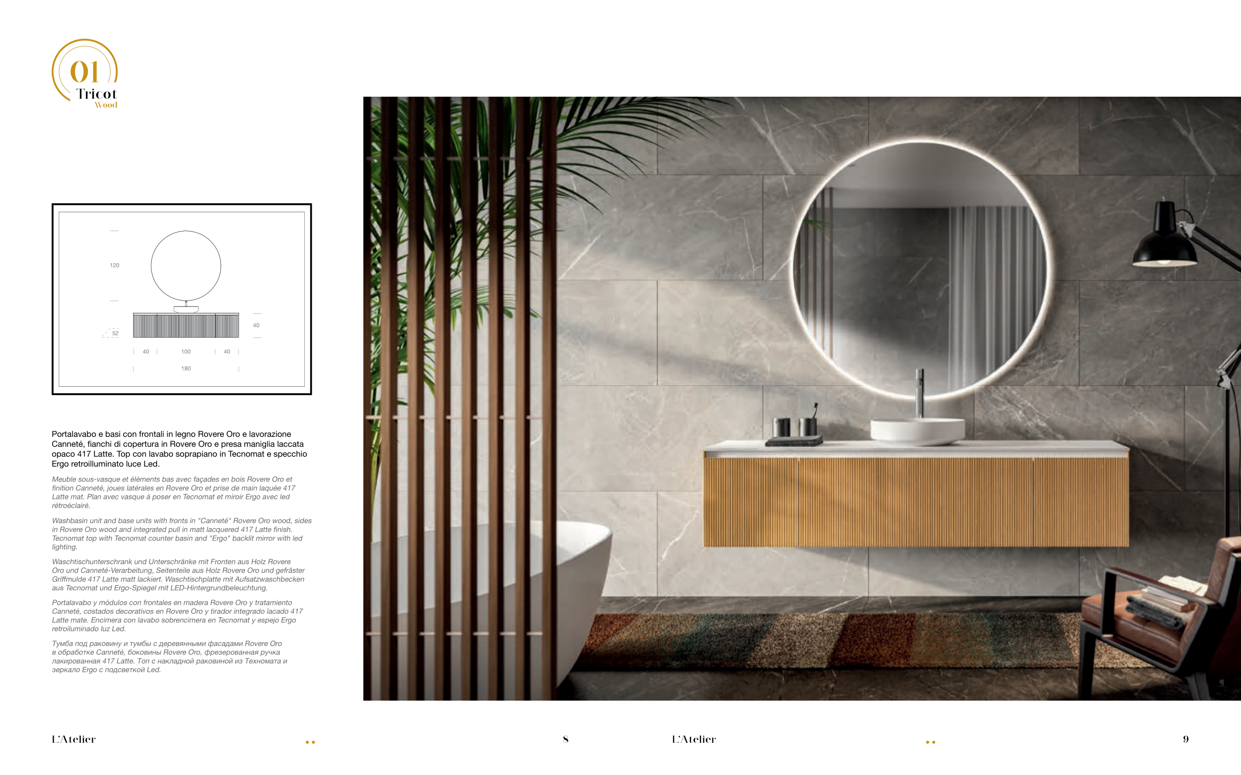 Washbasin unit and base units with fronts in "Canneté" Rovere Oro wood, sides