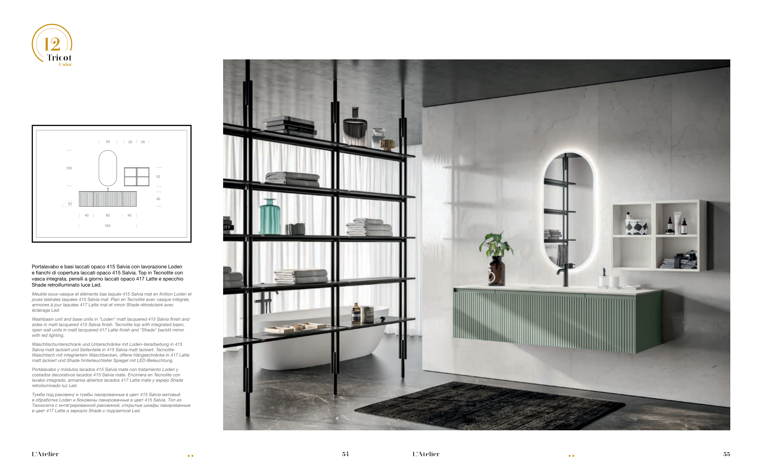 open wall units in matt lacquered 417 Latte finish and "Shade" backlit mirror