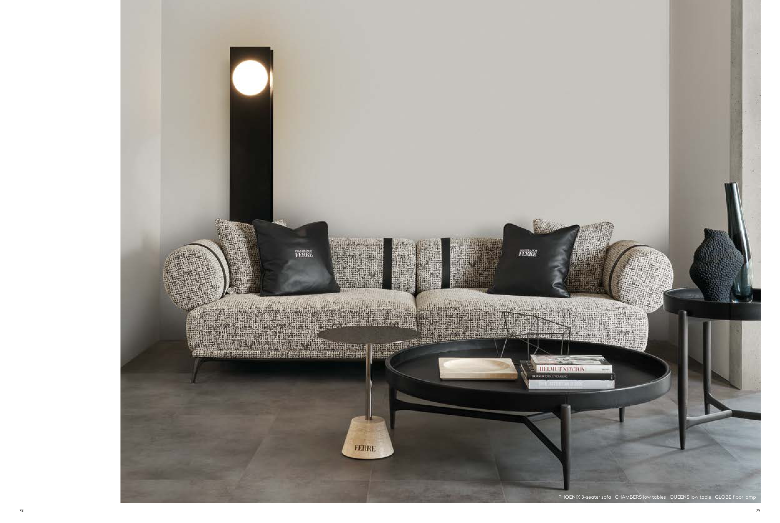 PHOENIX 3-seater sofa CHAMBERS low tables QUEENS low table GLOBE floor lamp