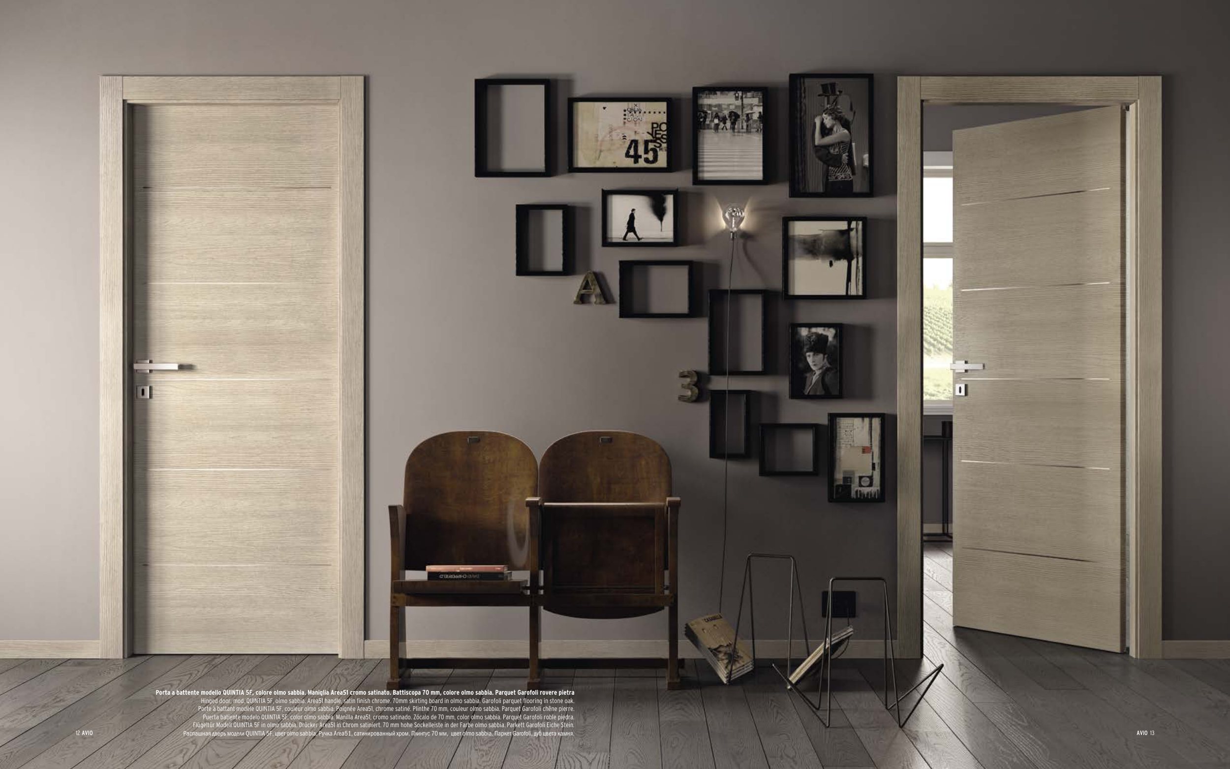 Распашная дверь модели QUINTIA 5F, цвет olmo sabbia. Ручка Area51, сатинированный хром. Плинтус 70 мм, цвет olmo sabbia. Паркет Garofoli, дуб цвета камня.