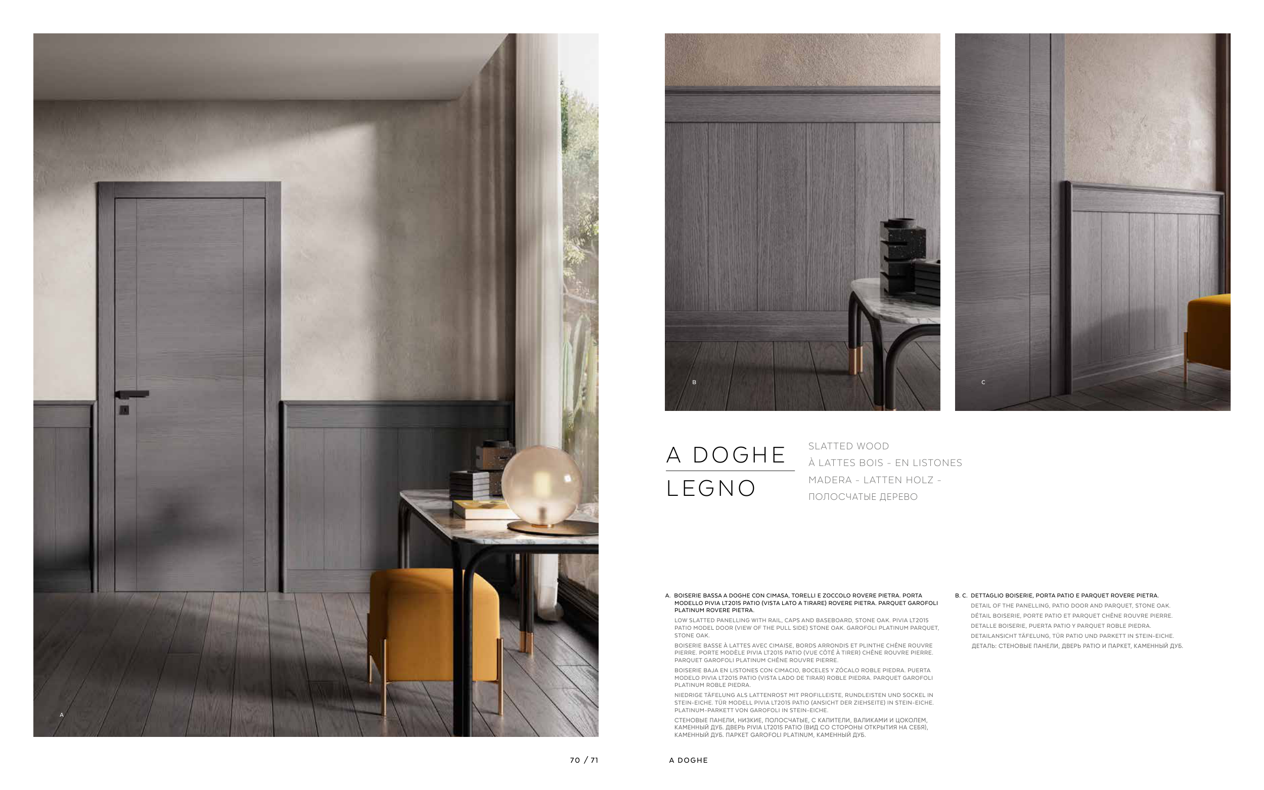 B. C. DETTAGLIO BOISERIE, PORTA PATIO E PARQUET ROVERE PIETRA.