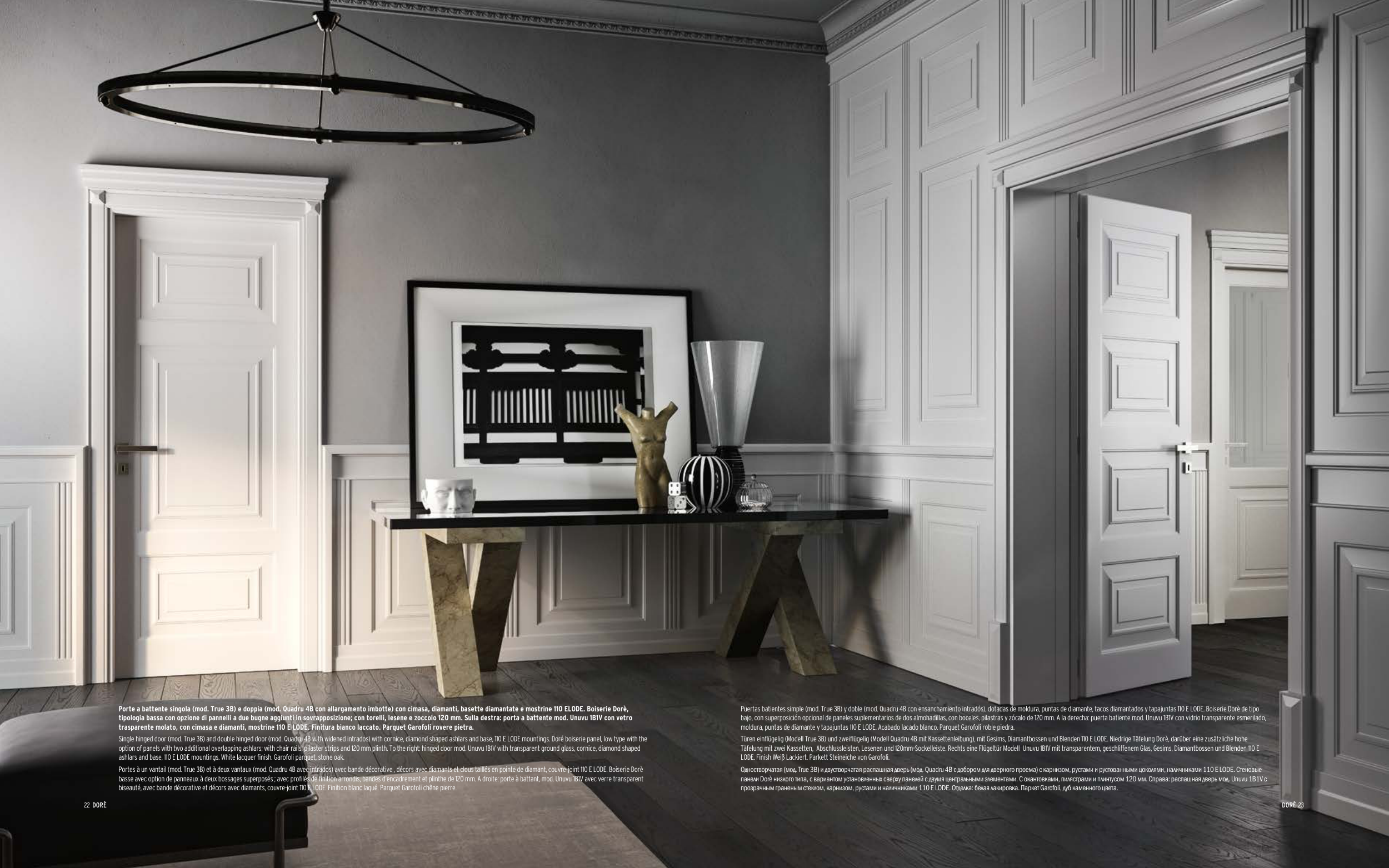 Single hinged door (mod. True 3B) and double hinged door (mod. Quadru 4B with widened intrados) with cornice, diamond shaped ashlars and base, 110 E LODE mountings. Doré boiserie panel, low type with the