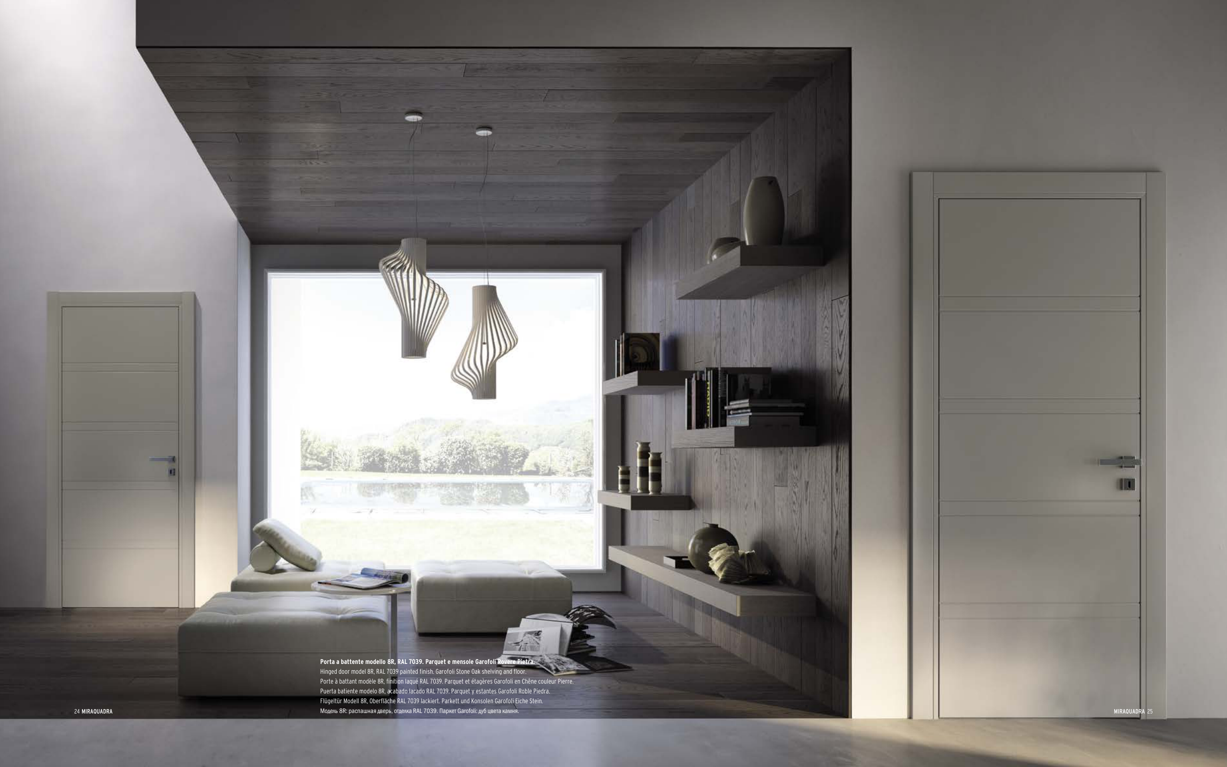 Flügeltür Modell 8R, Oberfläche RAL 7039 lackiert. Parkett und Konsolen Garofoli Eiche Stein.