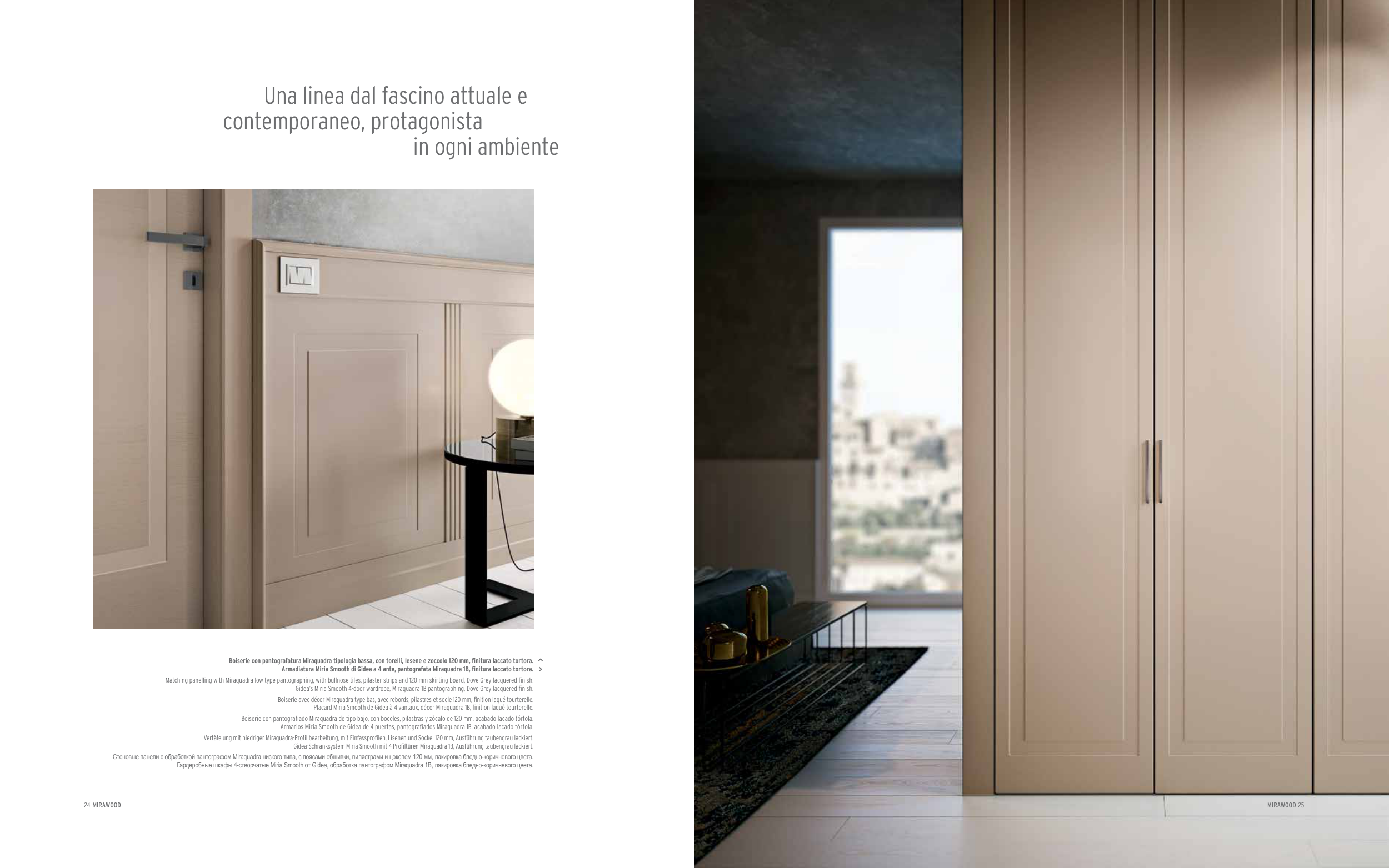 Gidea’s Miria Smooth 4-door wardrobe, Miraquadra 1B pantographing, Dove Grey lacquered finish.