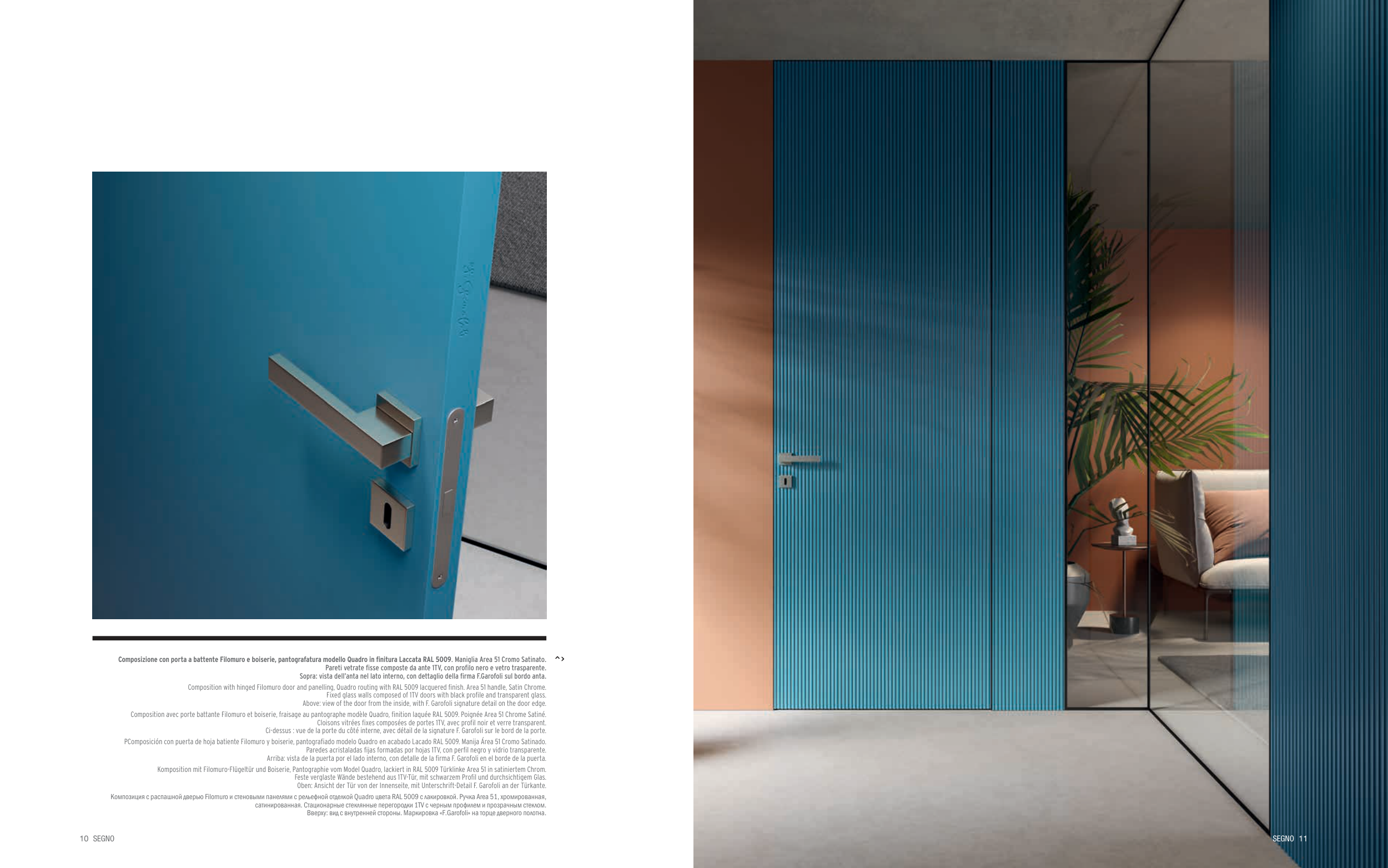 Composition avec porte battante Filomuro et boiserie, fraisage au pantographe modèle Quadro, finition laquée RAL 5009. Poignée Area 51 Chrome Satiné.