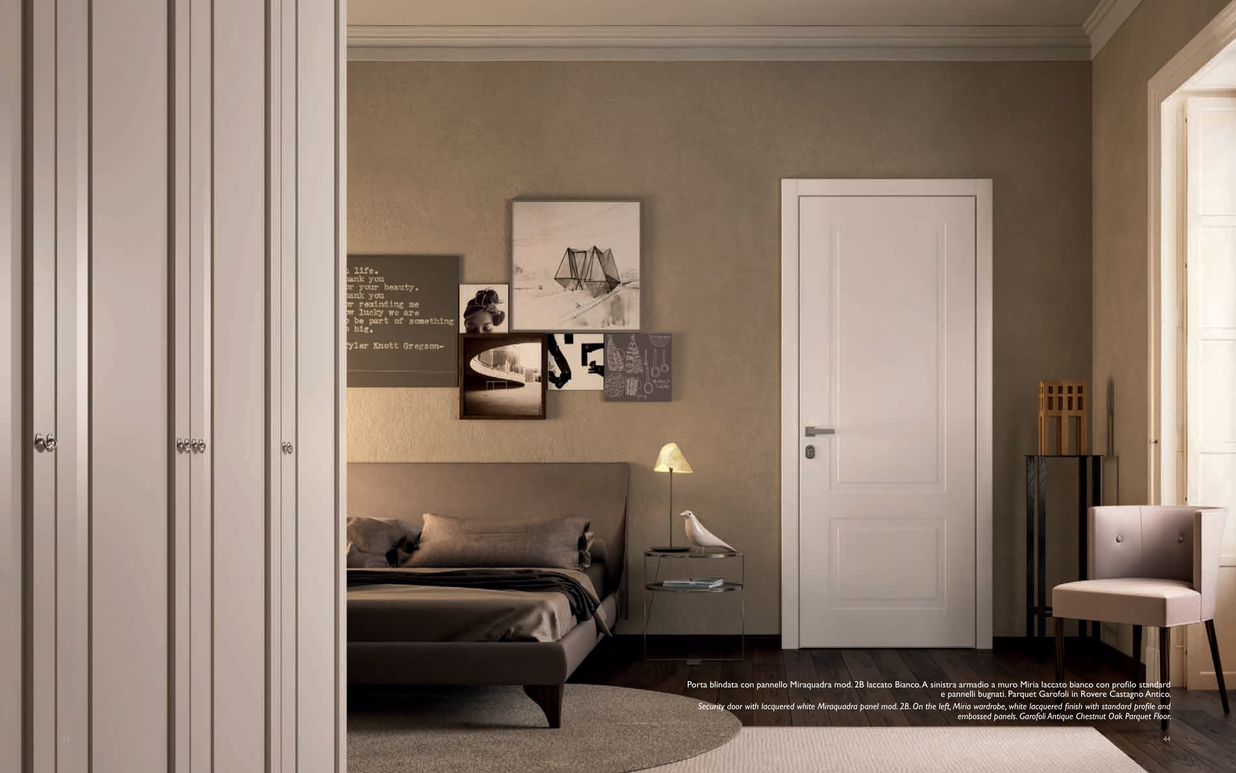 Security door with lacquered white Miraquadra panel mod. 2B. On the left, Miria wardrobe, white lacquered finish with standard profile and