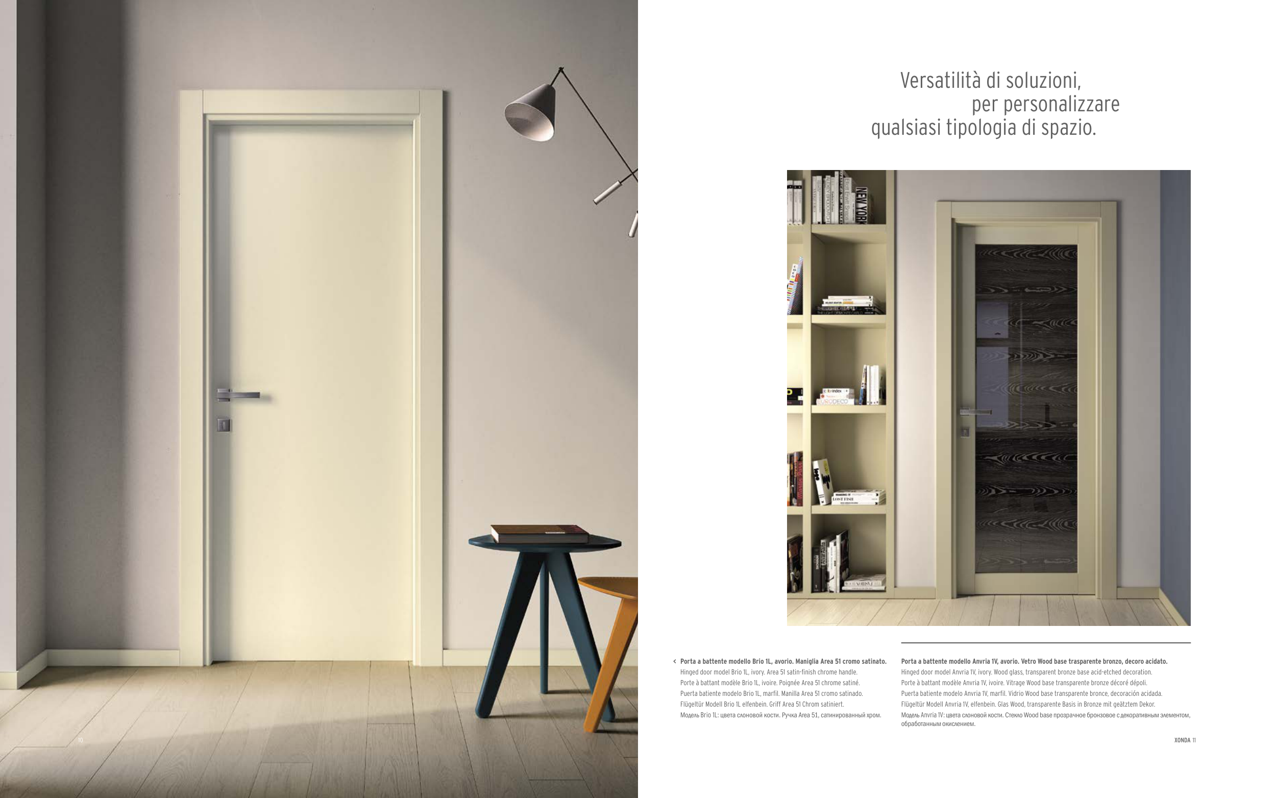Porta a battente modello Anvria 1V, avorio. Vetro Wood base trasparente bronzo, decoro acidato.