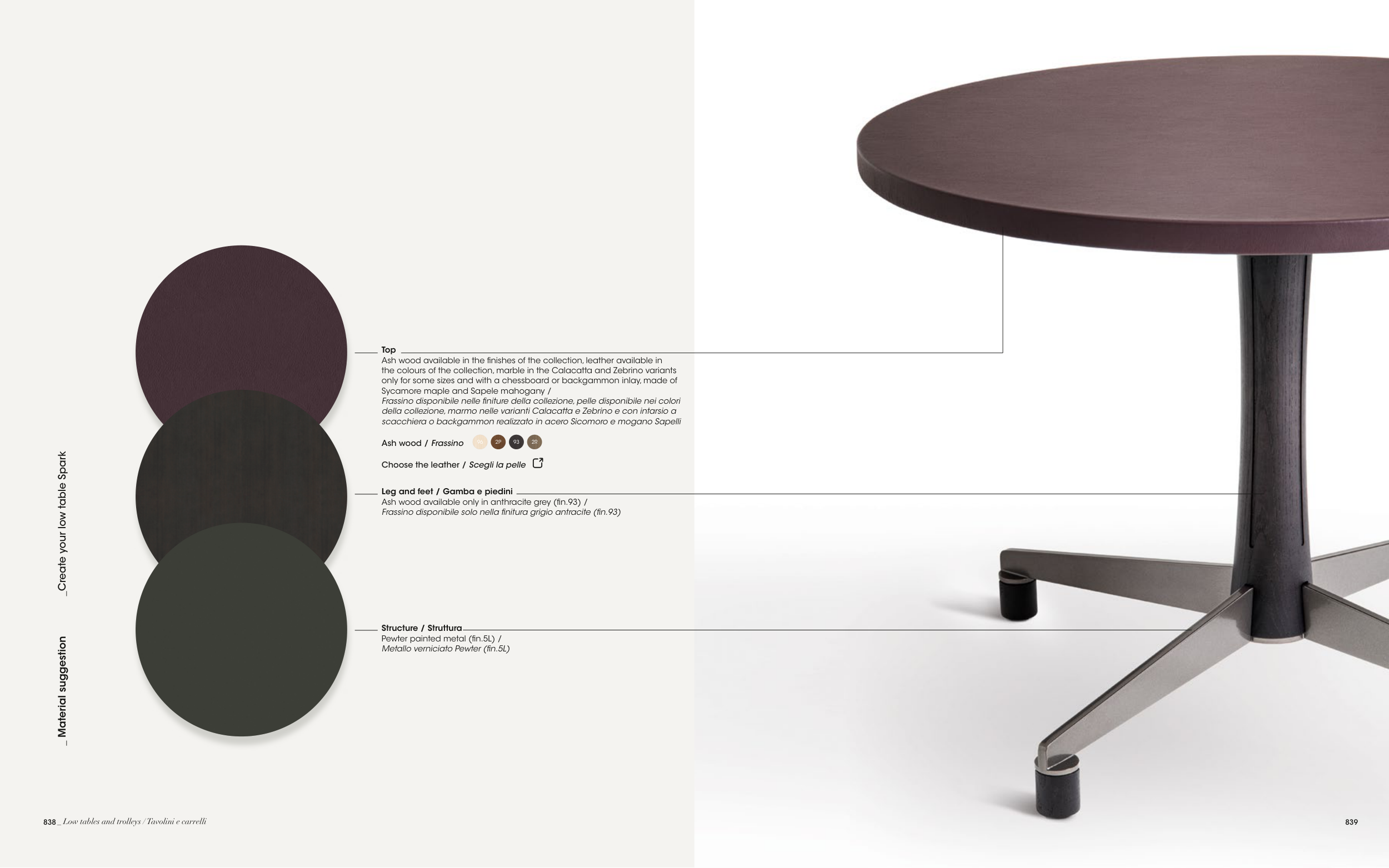 Ash wood available in the finishes of the collection, leather available in