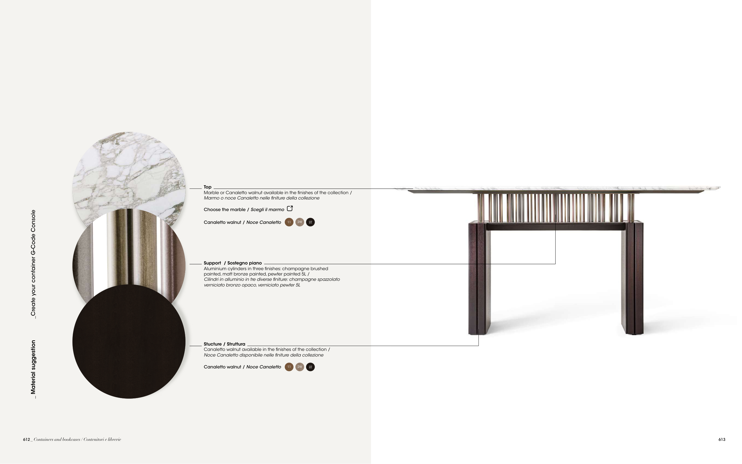 Marble or Canaletto walnut available in the finishes of the collection /