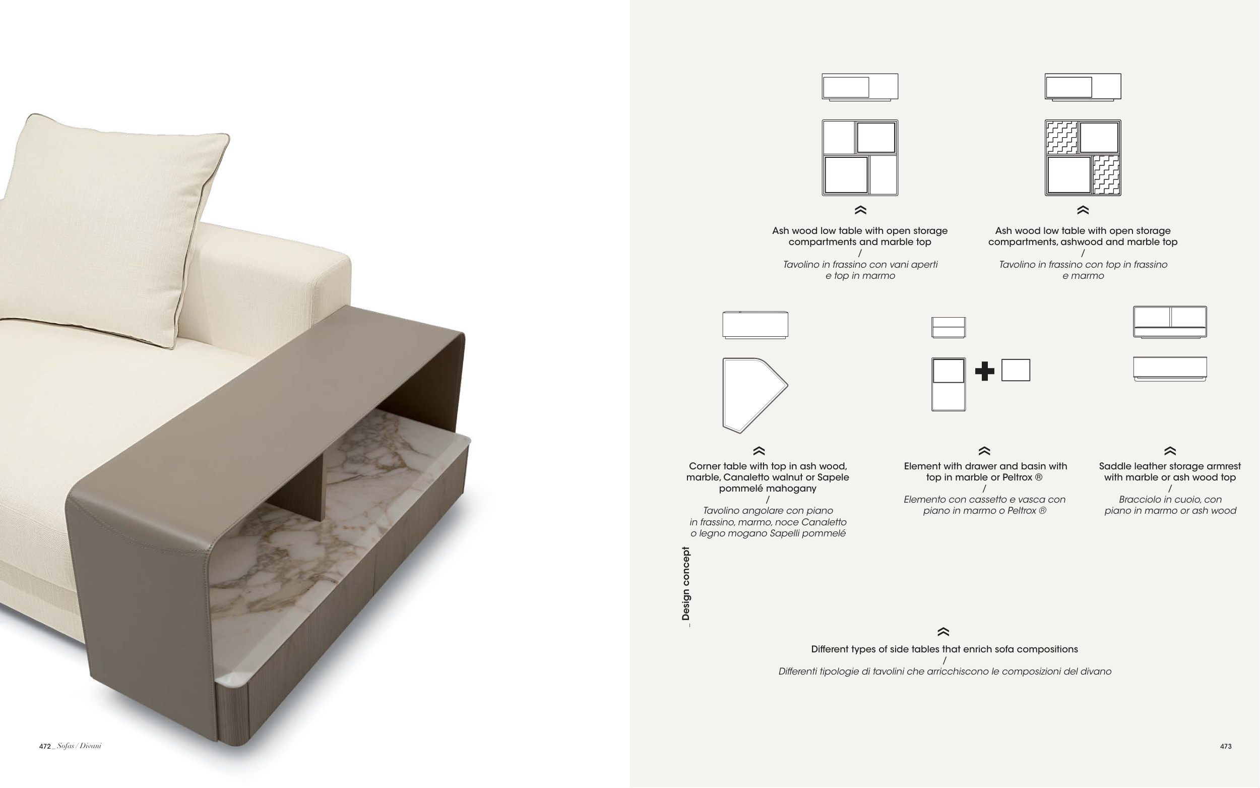 Differenti tipologie di tavolini che arricchiscono le composizioni del divano