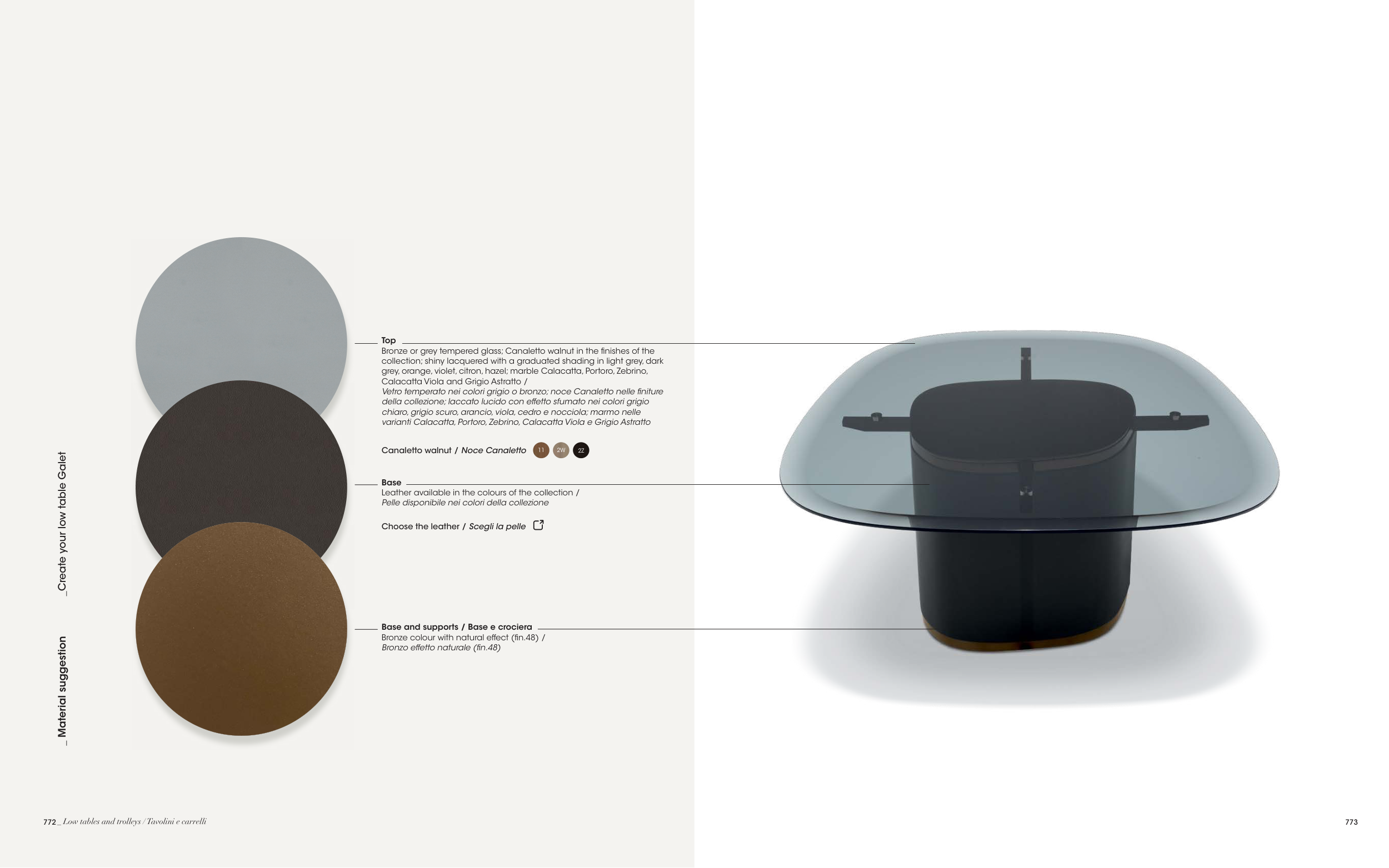 Bronze or grey tempered glass; Canaletto walnut in the finishes of the