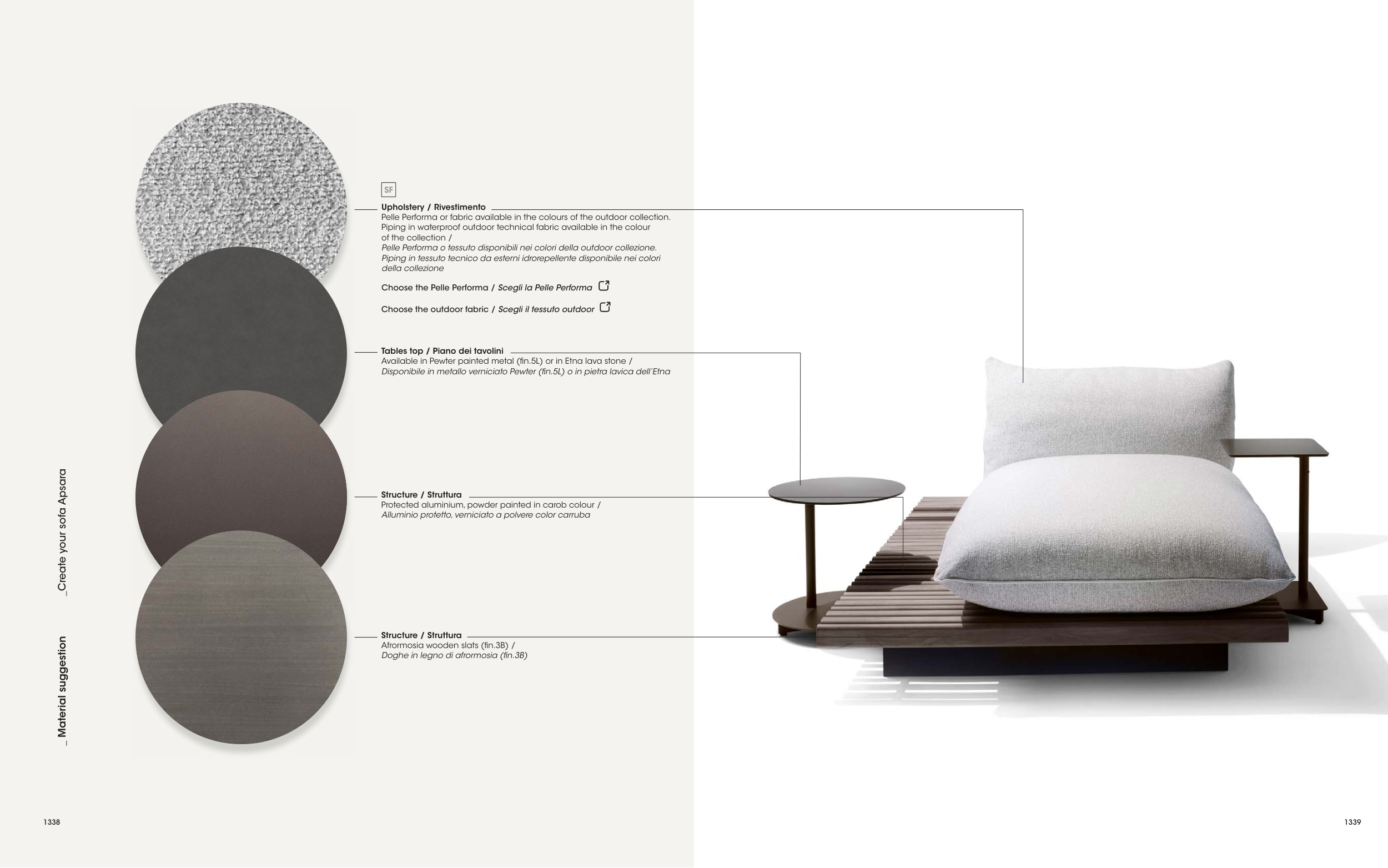Pelle Performa or fabric available in the colours of the outdoor collection.