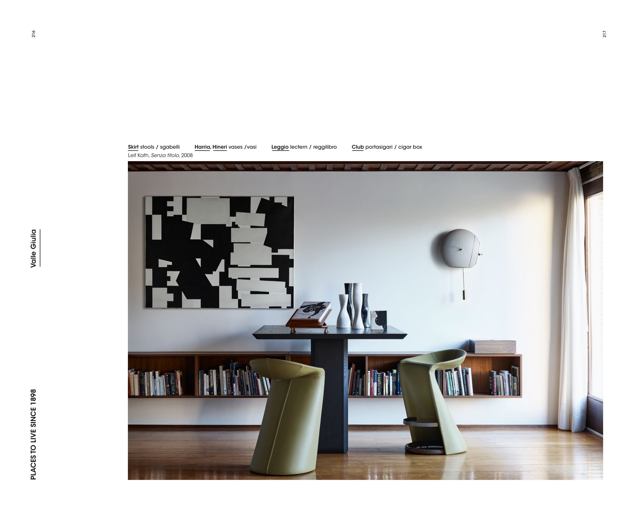 Skirt stools / sgabelli Harria, Hineri vases /vasi Leggio lectern / reggilibro Club portasigari / cigar box