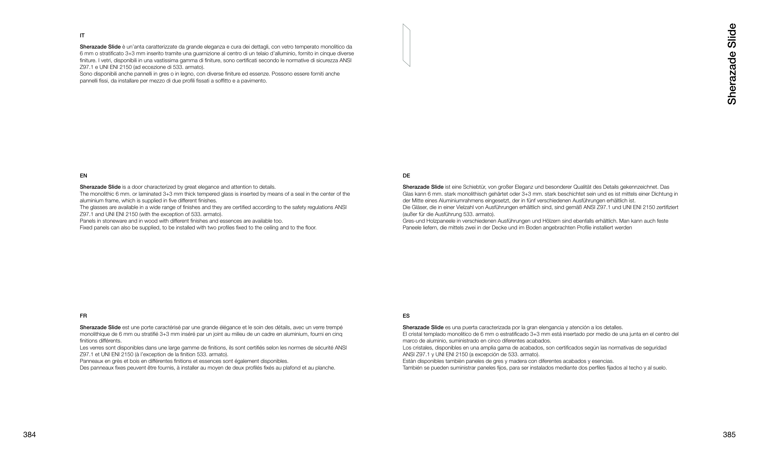 finiture. I vetri, disponibili in una vastissima gamma di finiture, sono certificati secondo le normative di sicurezza ANSI