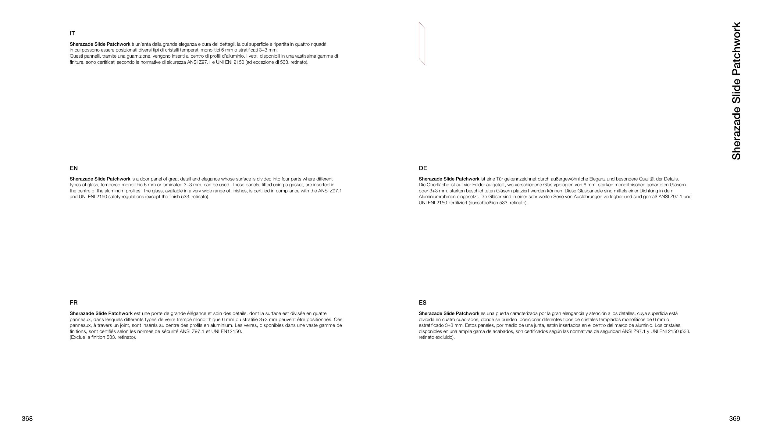 finiture, sono certificati secondo le normative di sicurezza ANSI Z97.1 e UNI ENI 2150 (ad eccezione di 533. retinato).