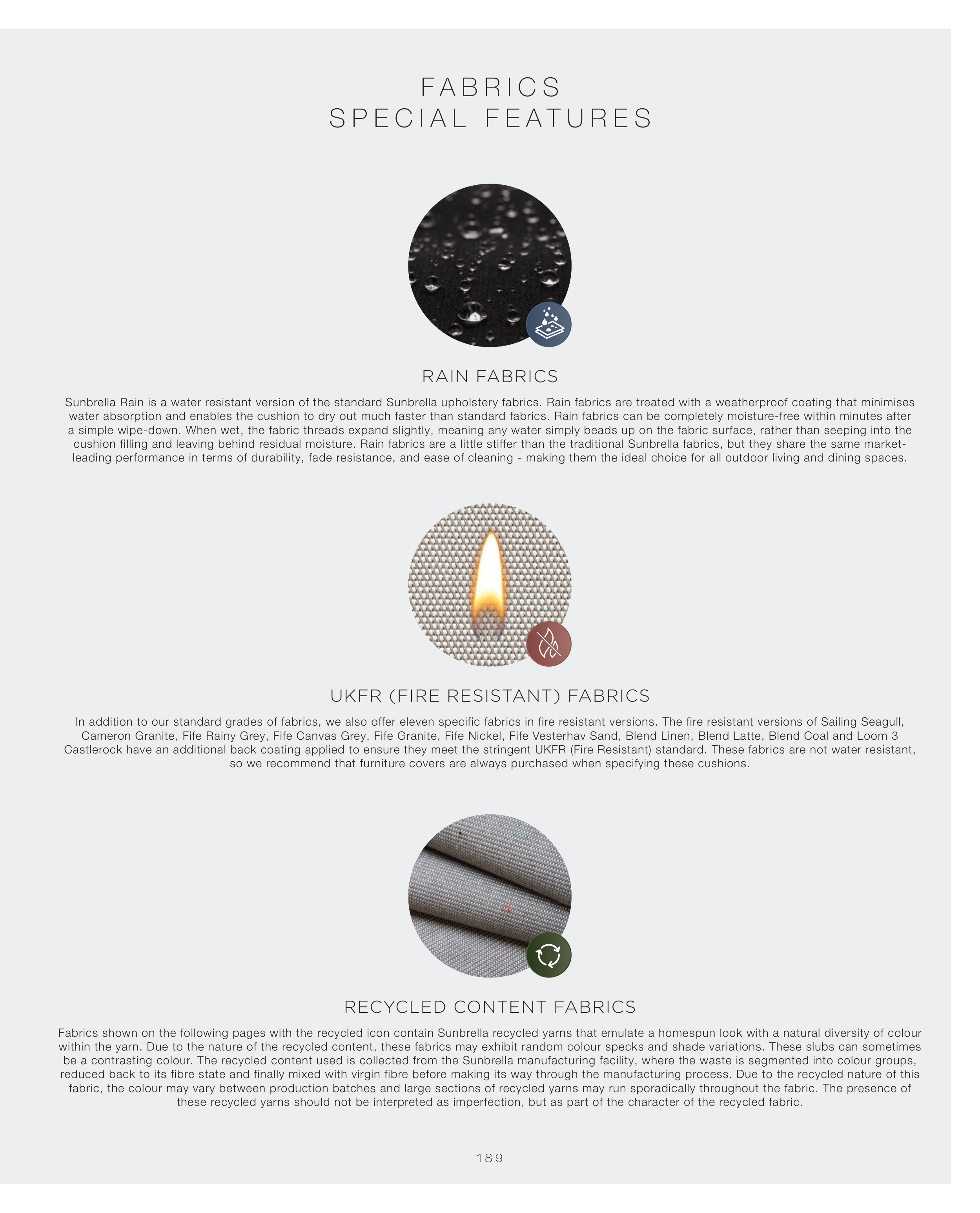 Fabrics shown on the following pages with the recycled icon contain Sunbrella recycled yarns that emulate a homespun look with a natural diversity of colour