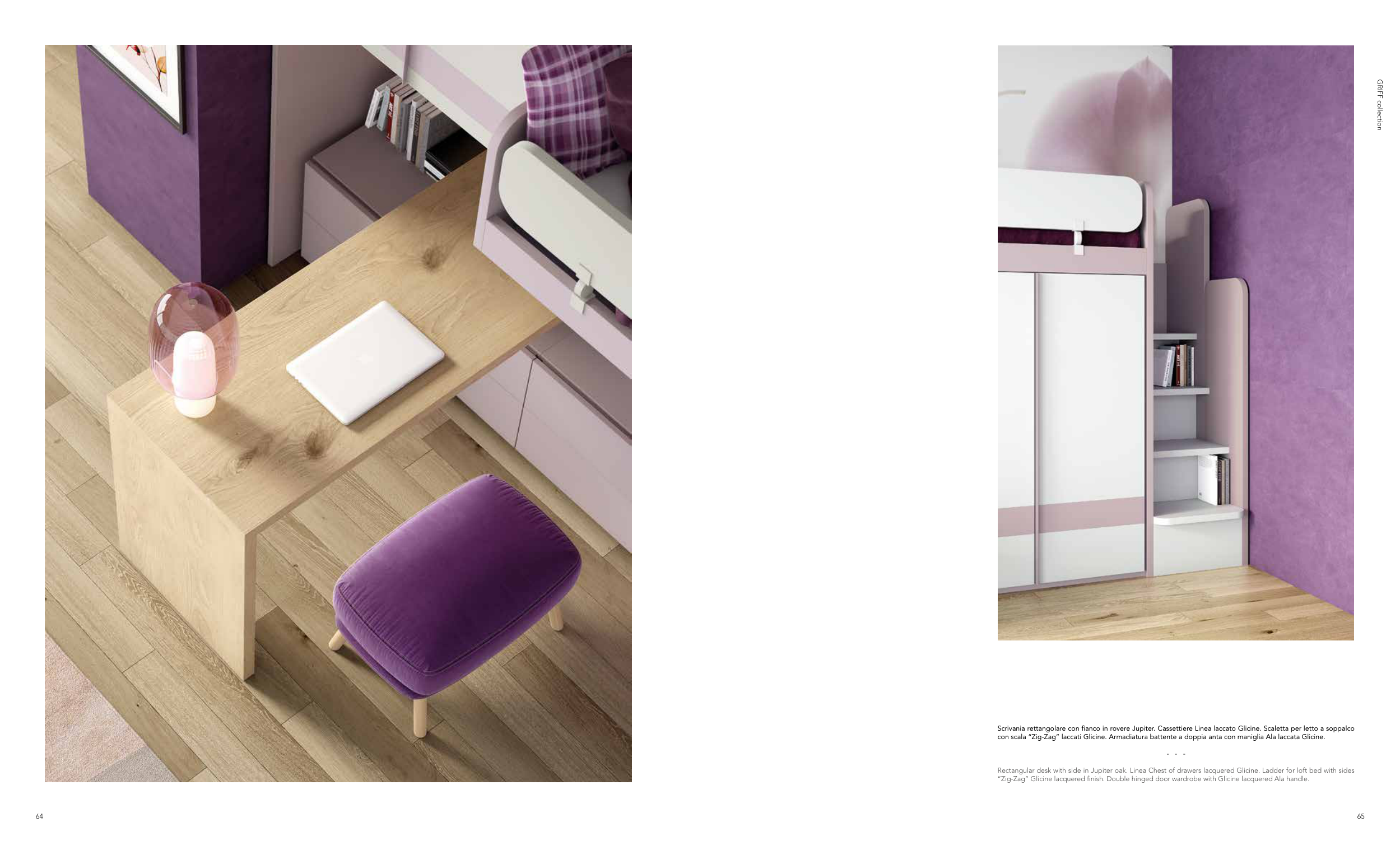 con scala “Zig-Zag” laccati Glicine. Armadiatura battente a doppia anta con maniglia Ala laccata Glicine.