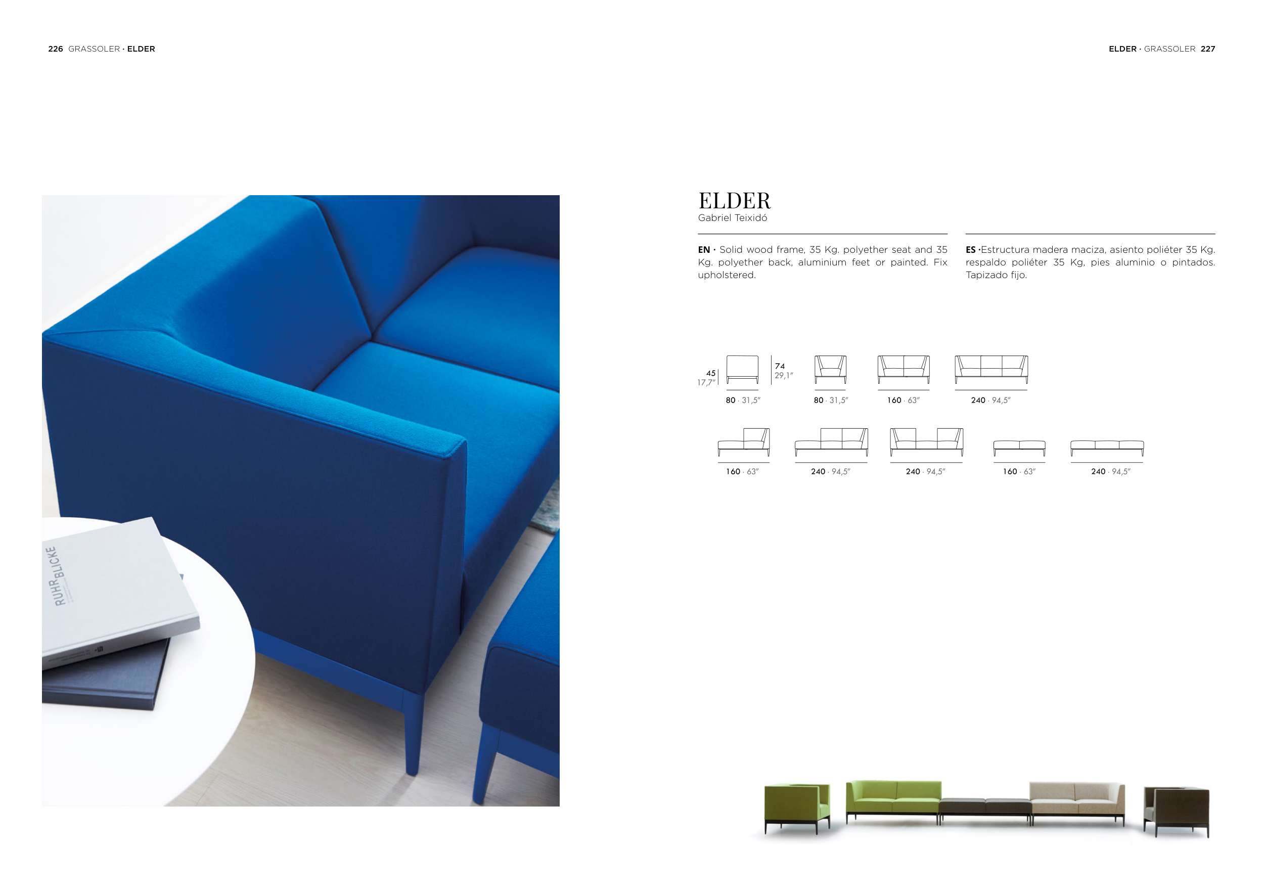 EN · Solid wood frame, 35 Kg. polyether seat and 35