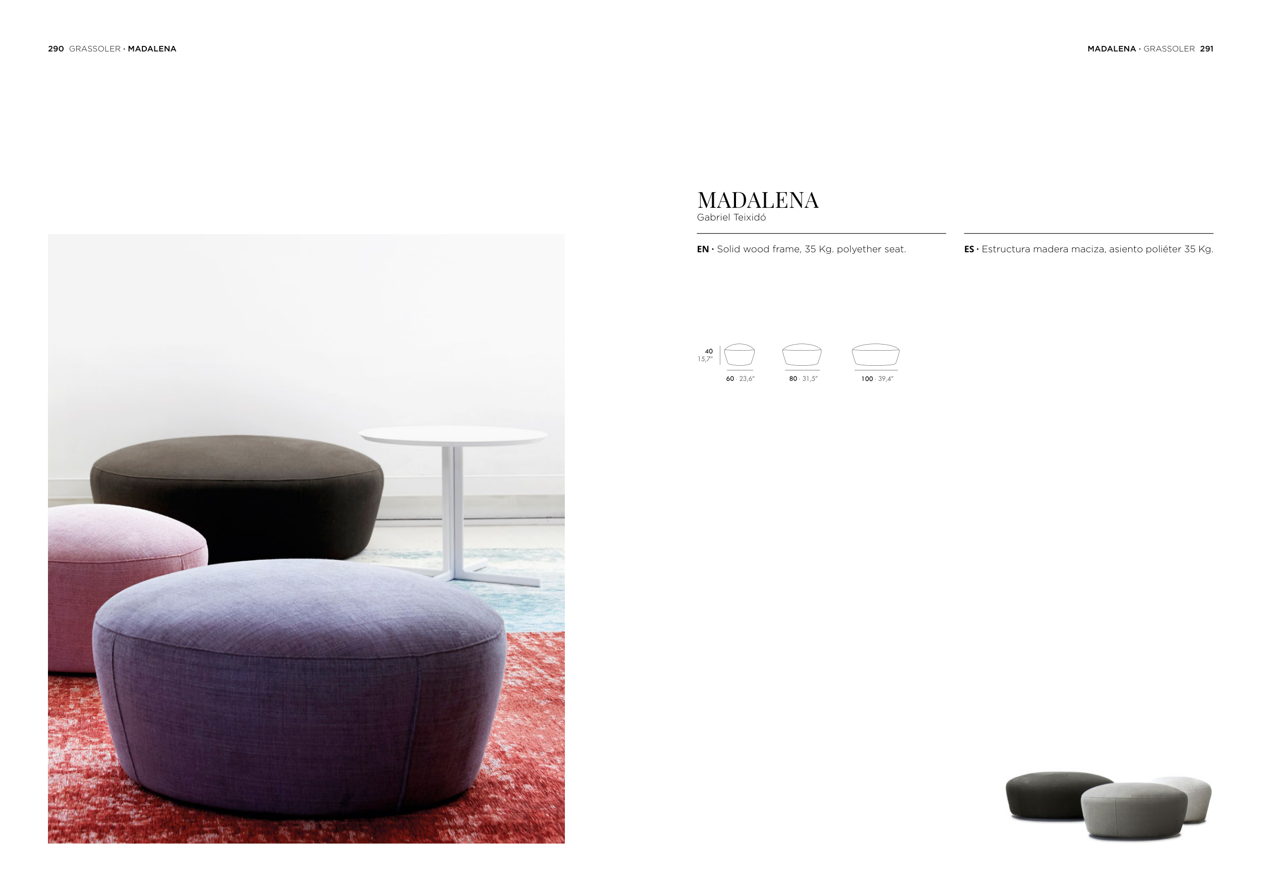 EN · Solid wood frame, 35 Kg. polyether seat.