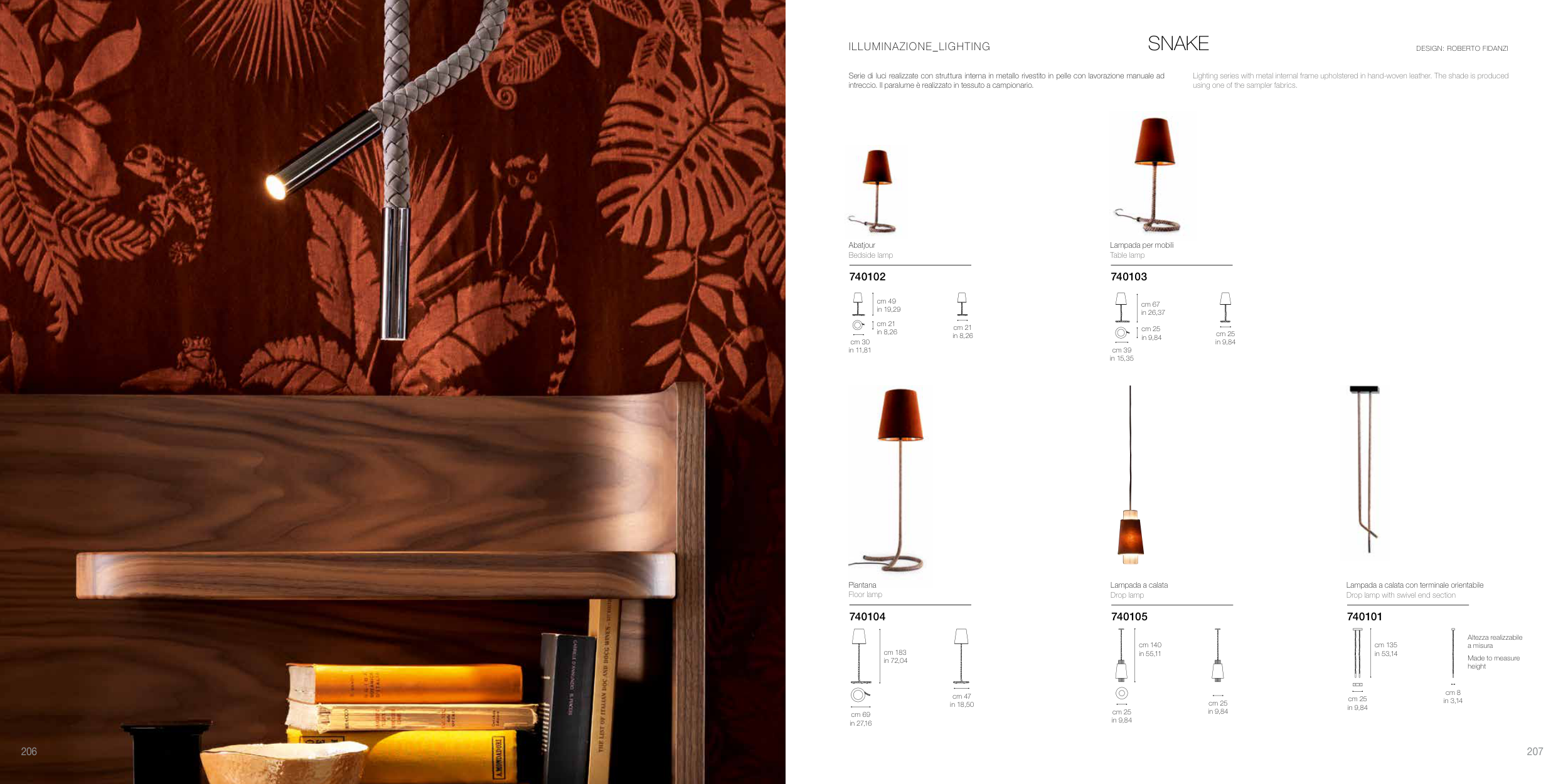 Lighting series with metal internal frame upholstered in hand-woven leather. The shade is produced