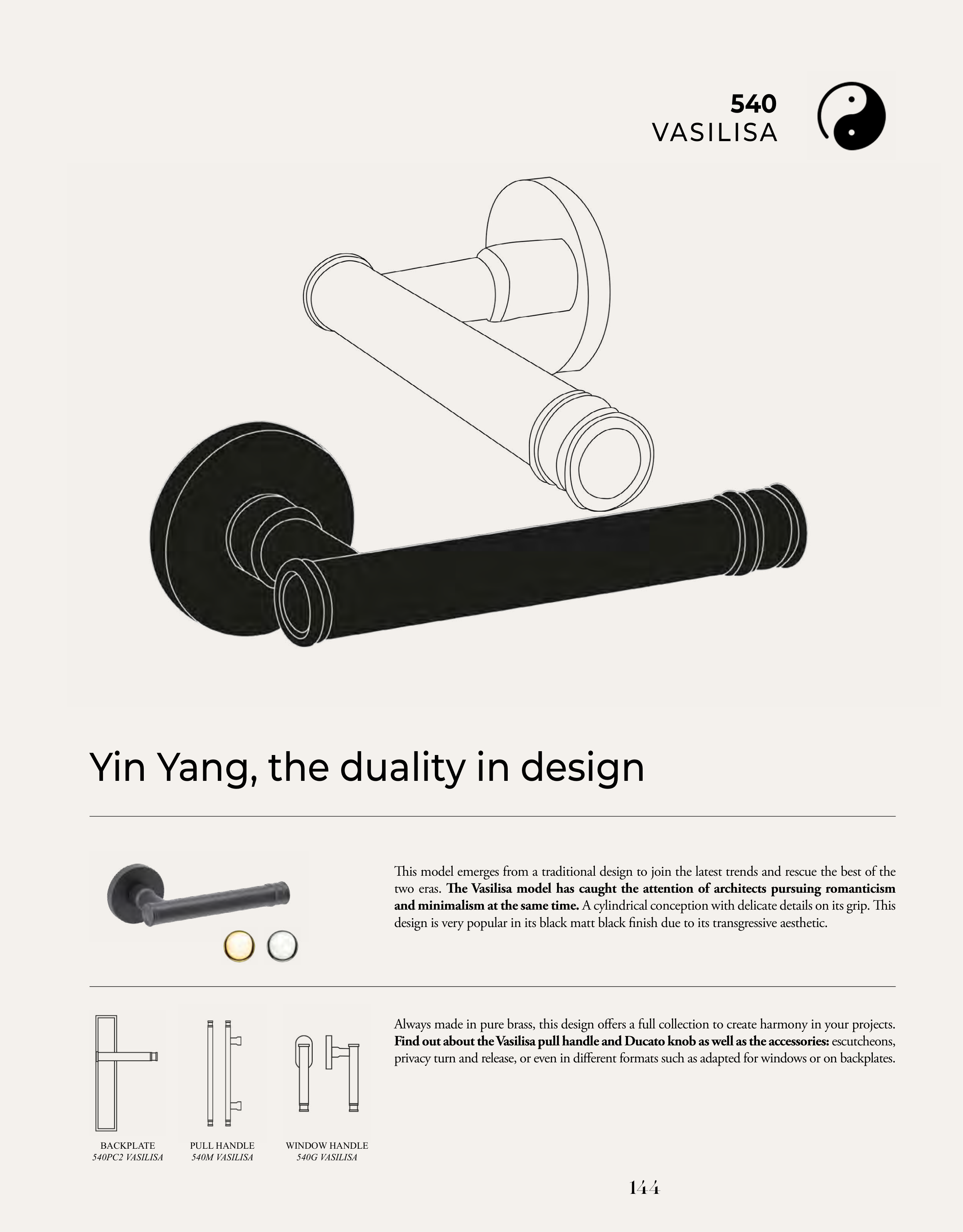 Find out about the Vasilisa pull handle and Ducato knob as well as the accessories: escutcheons,