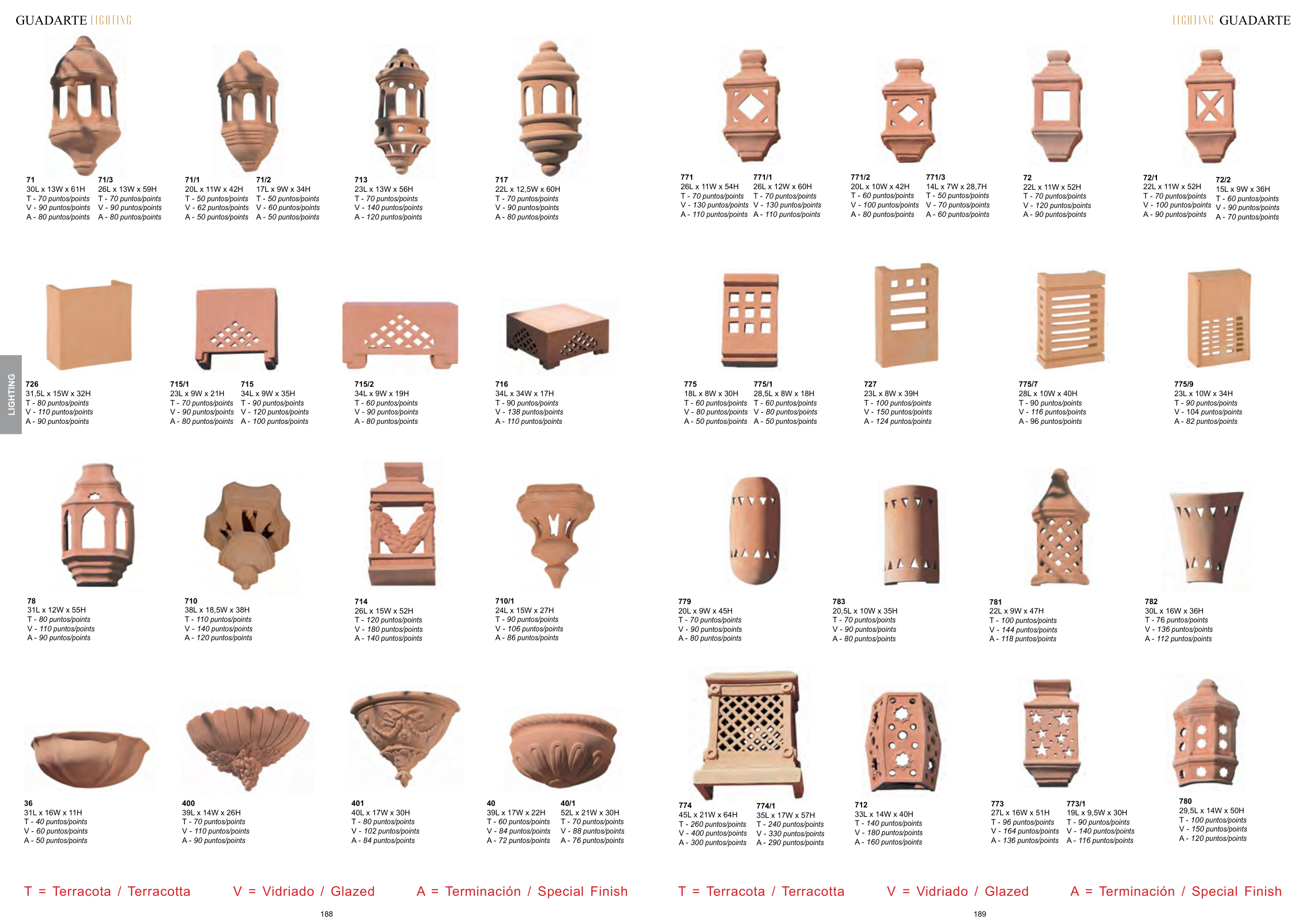 T = Terracota / Terracotta V = Vidriado / Glazed A = Terminación / Special Finish