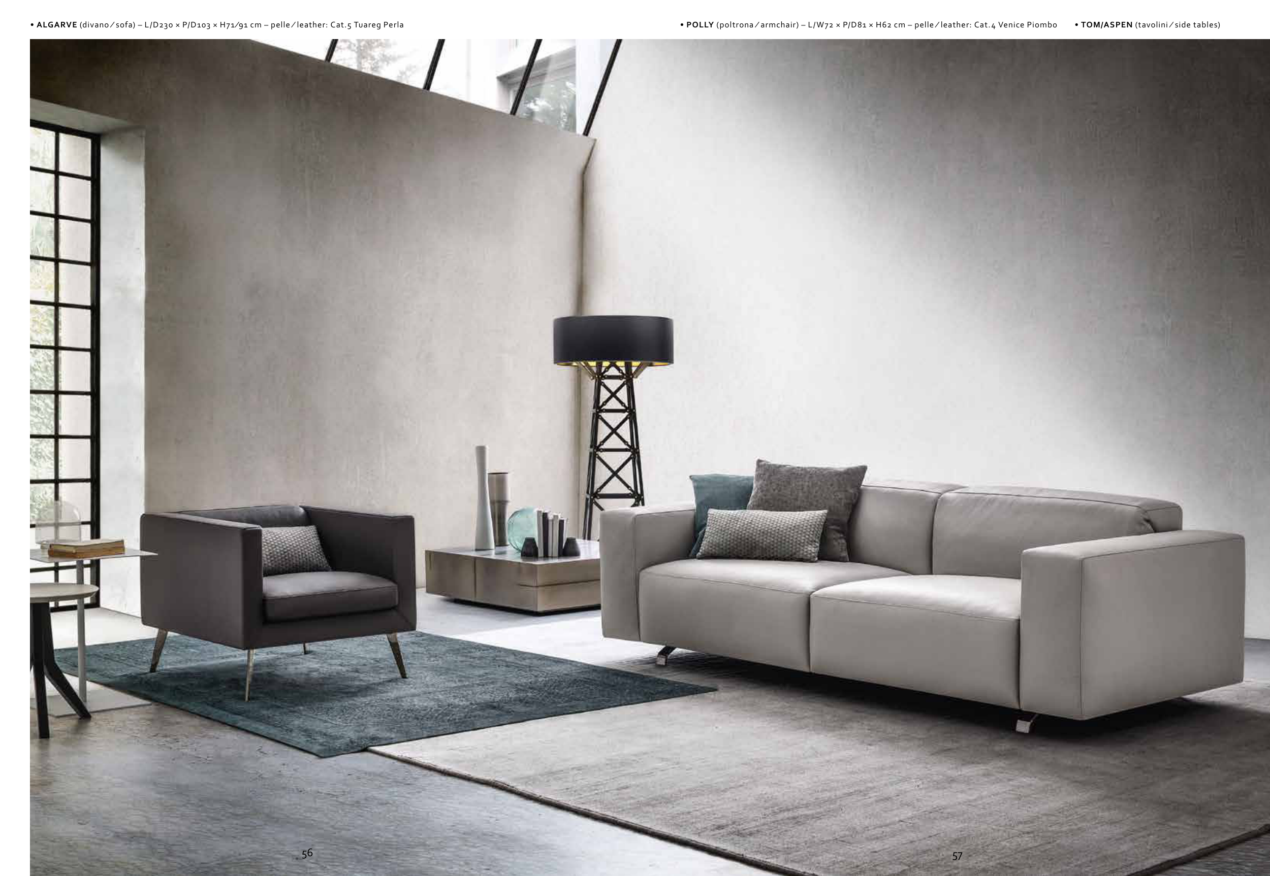 • POLLY (poltrona ∕ armchair) – L/W72 × P/D81 × H62 cm – pelle ∕ leather: Cat.4 Venice Piombo • TOM/ASPEN (tavolini ∕ side tables)