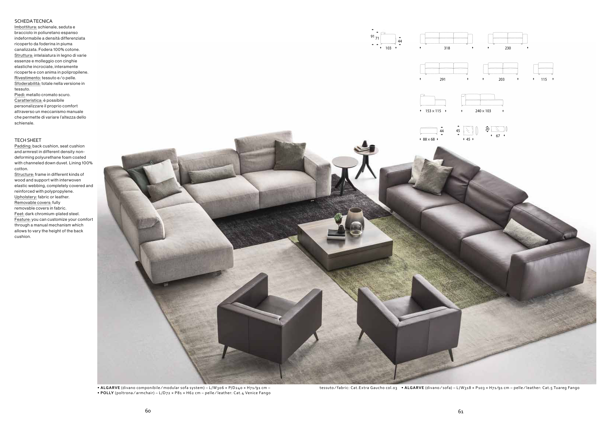 • ALGARVE (divano componibile ∕ modular sofa system) – L/W306 × P/D240 × H71 ∕91 cm – tessuto ∕ fabric: Cat.Extra Gaucho col.03 • ALGARVE (divano ∕ sofa) – L/W318 × P103 × H71 ∕91 cm – pelle ∕ leather: Cat.5 Tuareg Fango