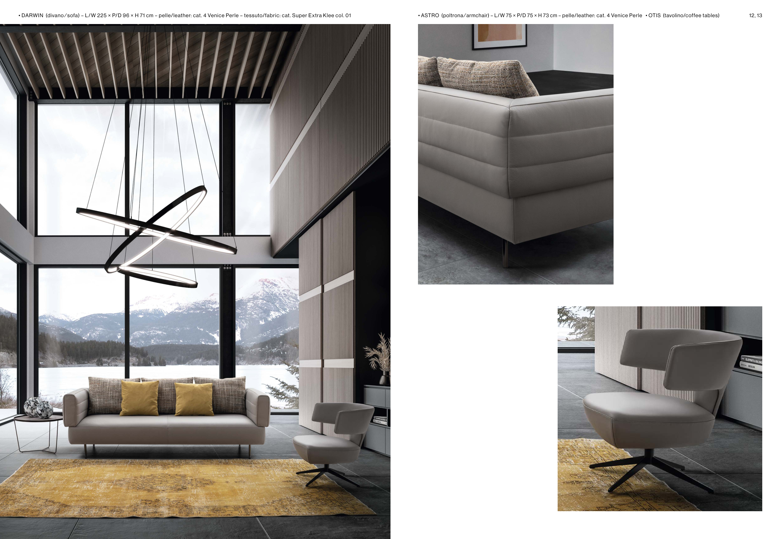 • DARWIN (divano ∕ sofa) – L/W 225 × P/D 96 × H 71 cm – pelle/leather: cat. 4 Venice Perle – tessuto/fabric: cat. Super Extra Klee col. 01