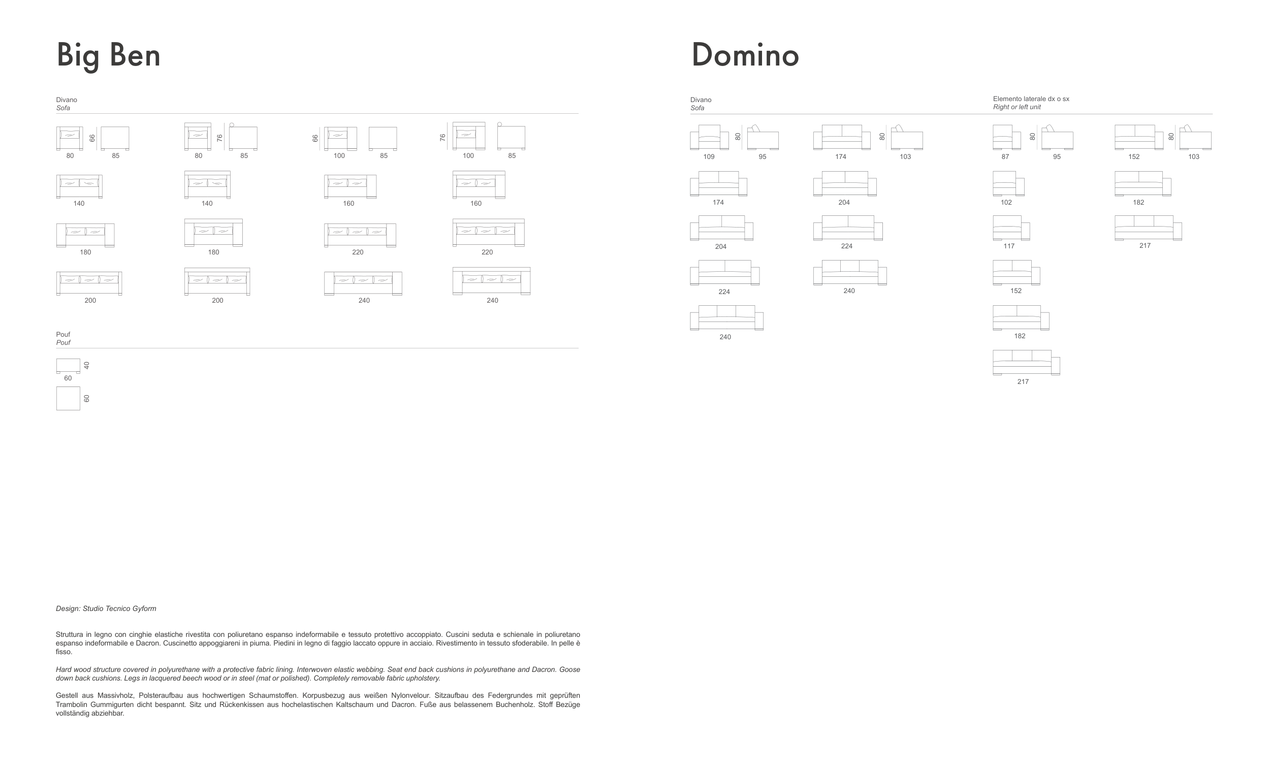 espanso indeformabile e Dacron. Cuscinetto appoggiareni in piuma. Piedini in legno di faggio laccato oppure in acciaio. Rivestimento in tessuto sfoderabile. In pelle è