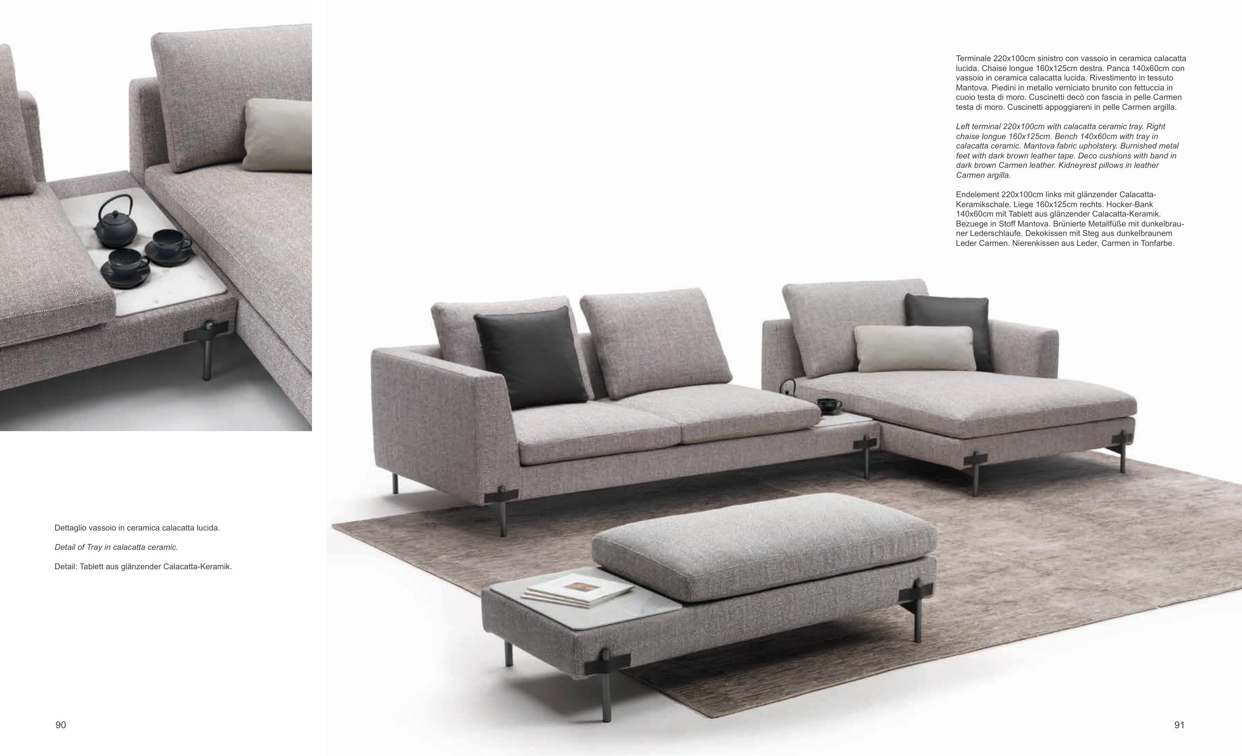 Left terminal 220x100cm with calacatta ceramic tray. Right