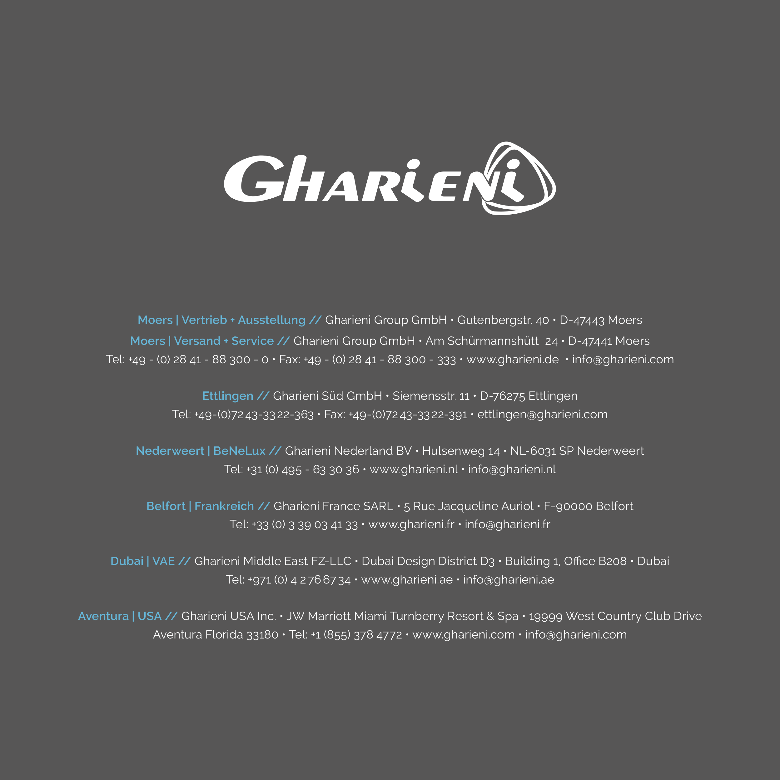 Tel: +49 - (0) 28 41 - 88 300 - 0 • Fax: +49 - (0) 28 41 - 88 300 - 333 • www.gharieni.de • info@gharieni.com