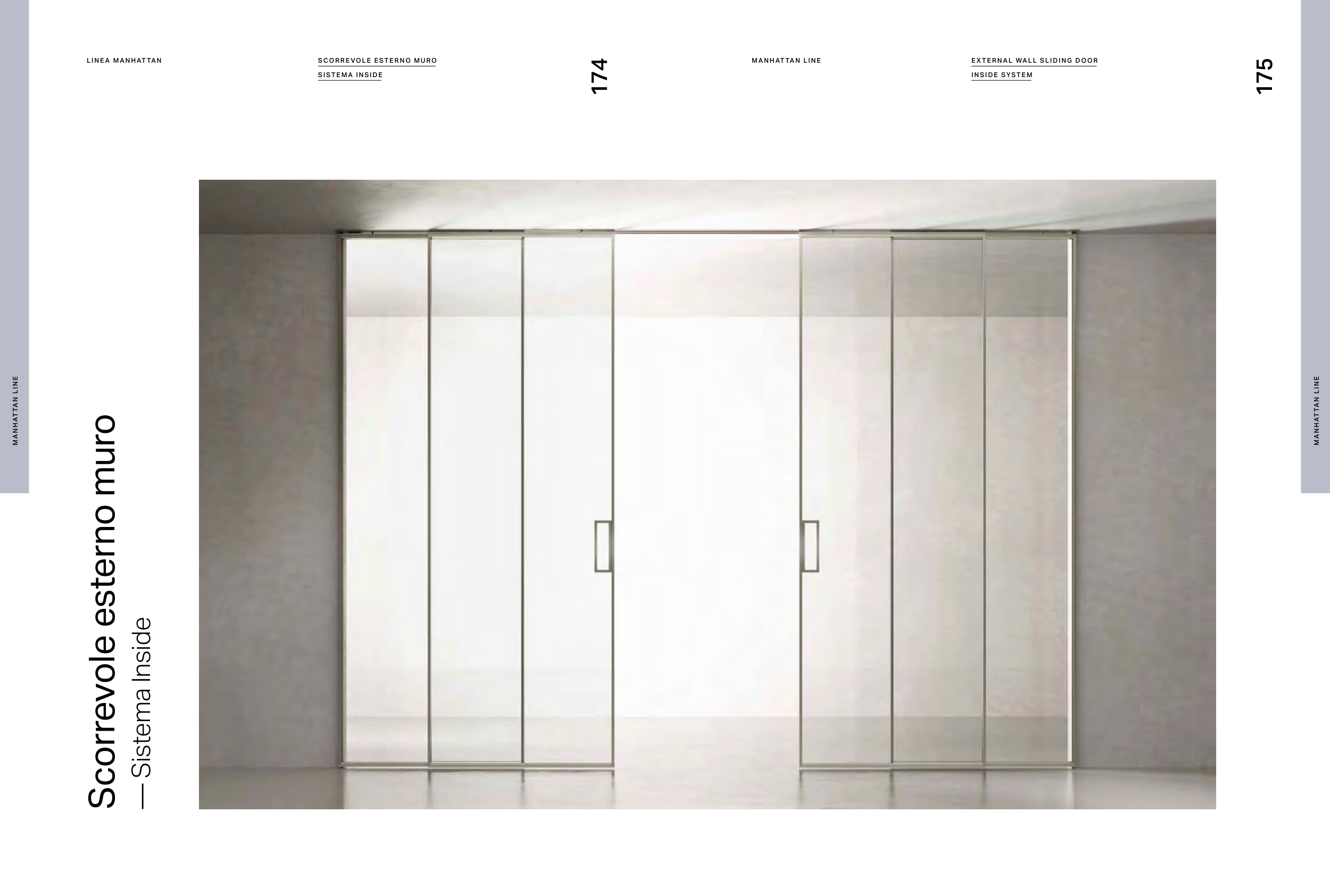 Scorrevole esterno muro — Sistema Inside 175 174 M AN H AT TAN L I N E M AN H AT TAN L I N E S C O R R E VO L E E ST E R N O M U RO S I ST E M A I N S I D E E X TE RN A L WA L L SLI DI NG DO O R IN S IDE SYSTE M MA N HAT TA N L IN E LI NE A MAN HAT TA N