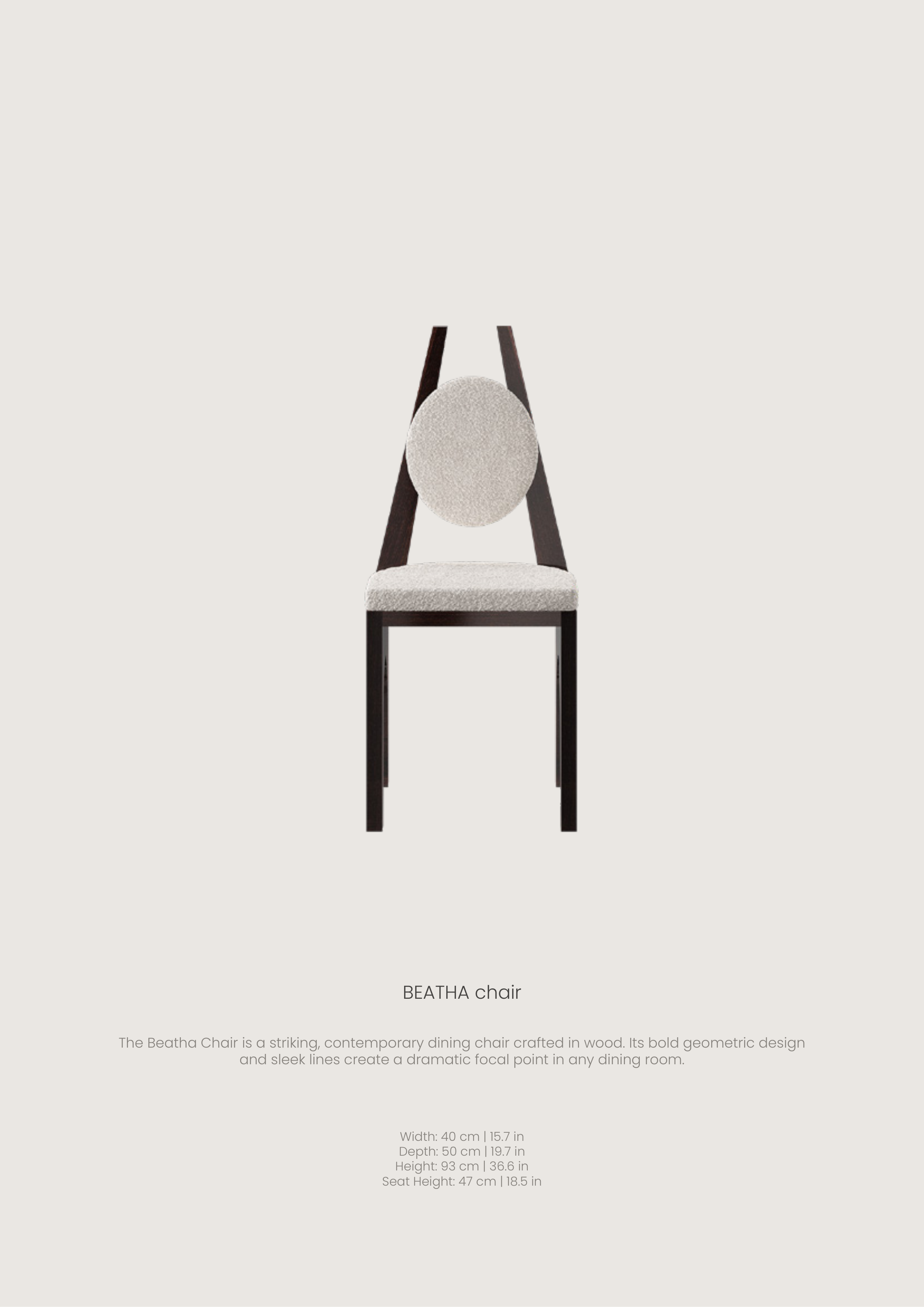 The Beatha Chair is a striking, contemporary dining chair crafted in wood. Its bold geometric design