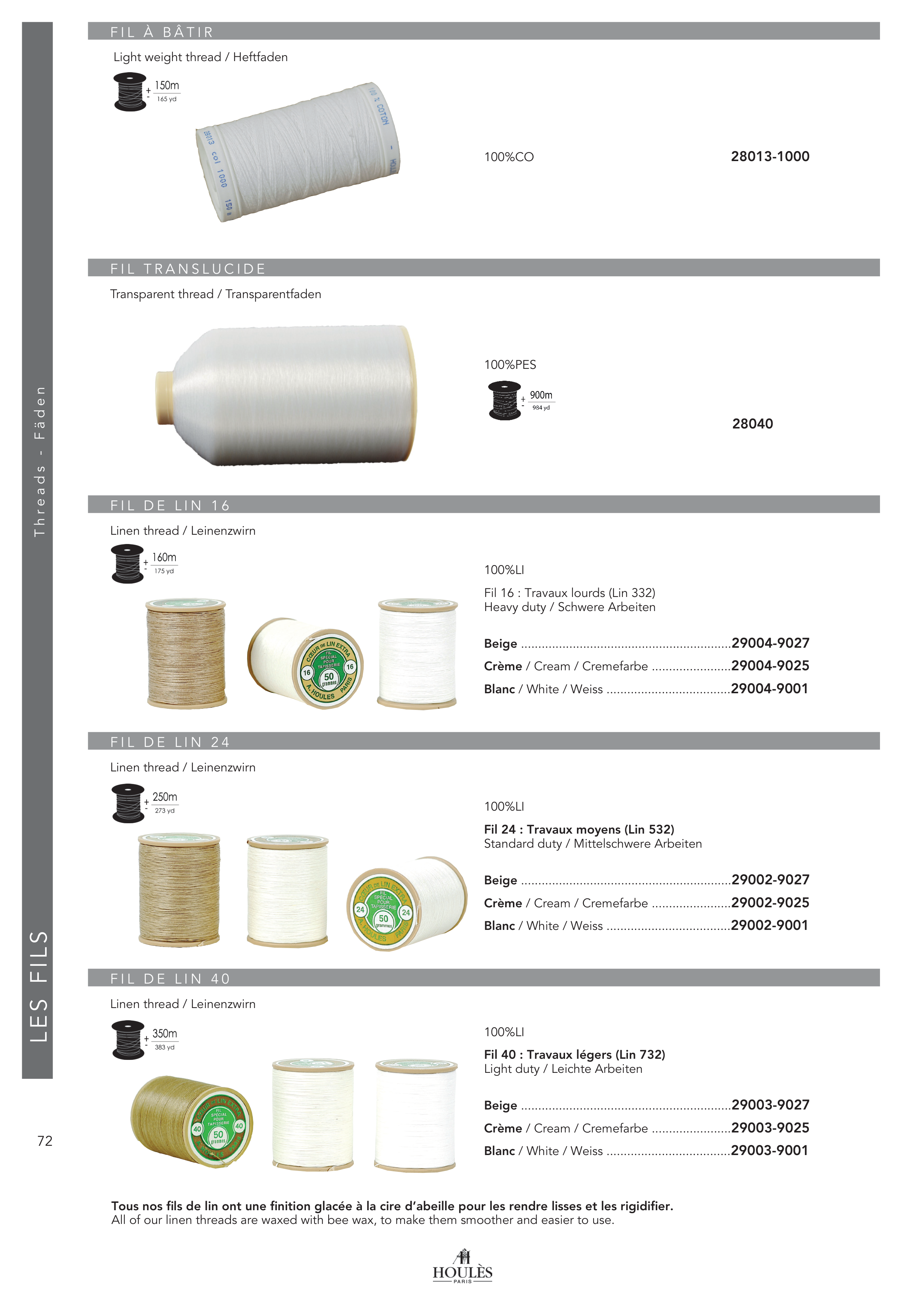 Tous nos fils de lin ont une finition glacée à la cire d’abeille pour les rendre lisses et les rigidifier.