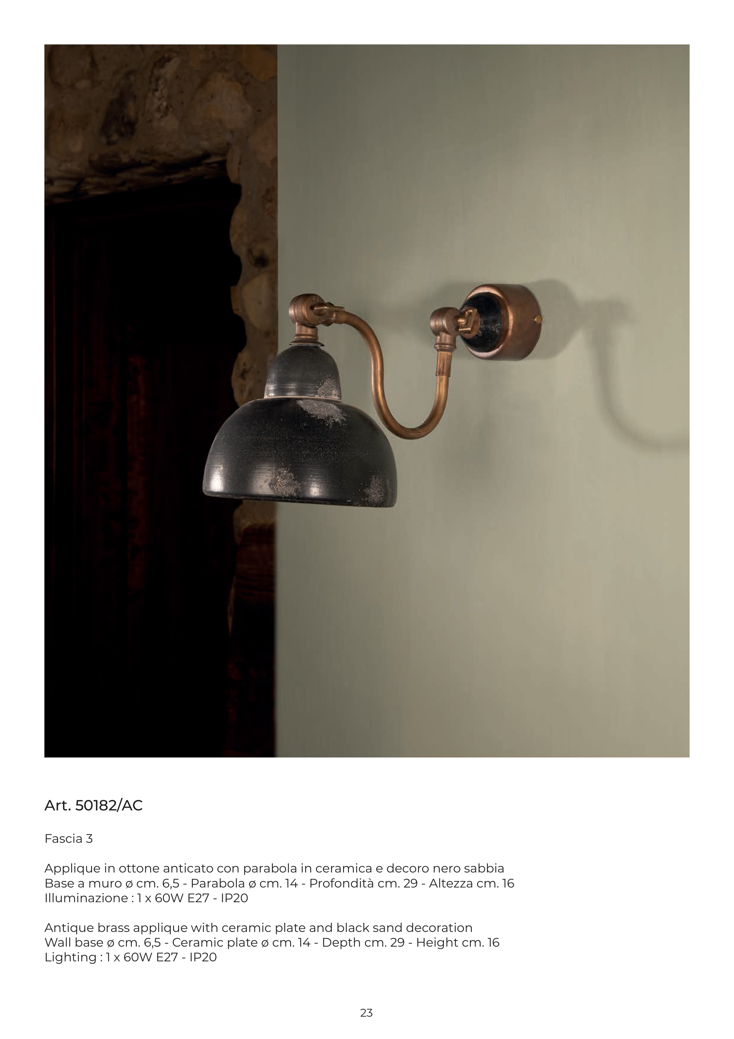 Applique in ottone anticato con parabola in ceramica e decoro nero sabbia
