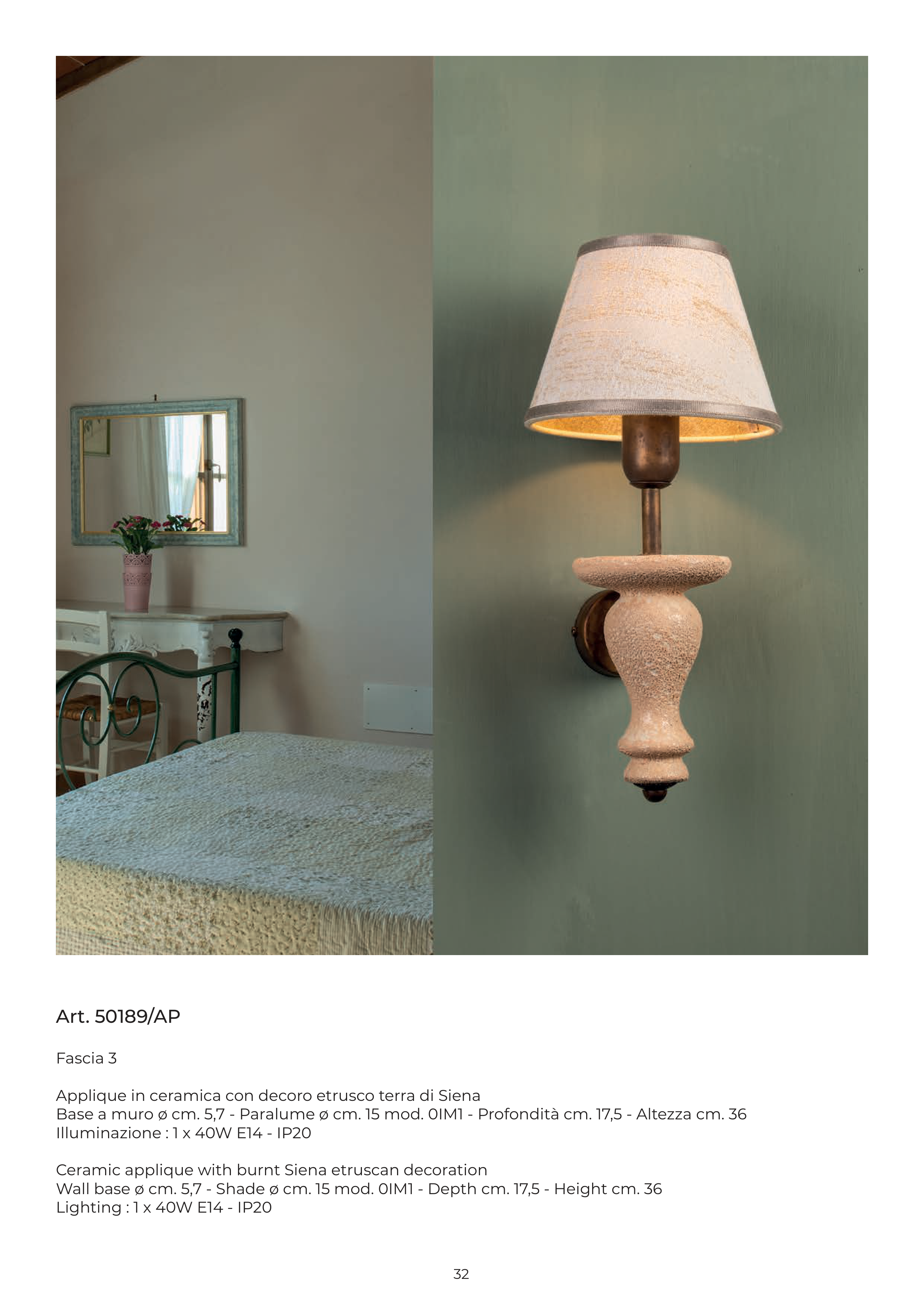 Base a muro ø cm. 5,7 - Paralume ø cm. 15 mod. 0IM1 - Profondità cm. 17,5 - Altezza cm. 36