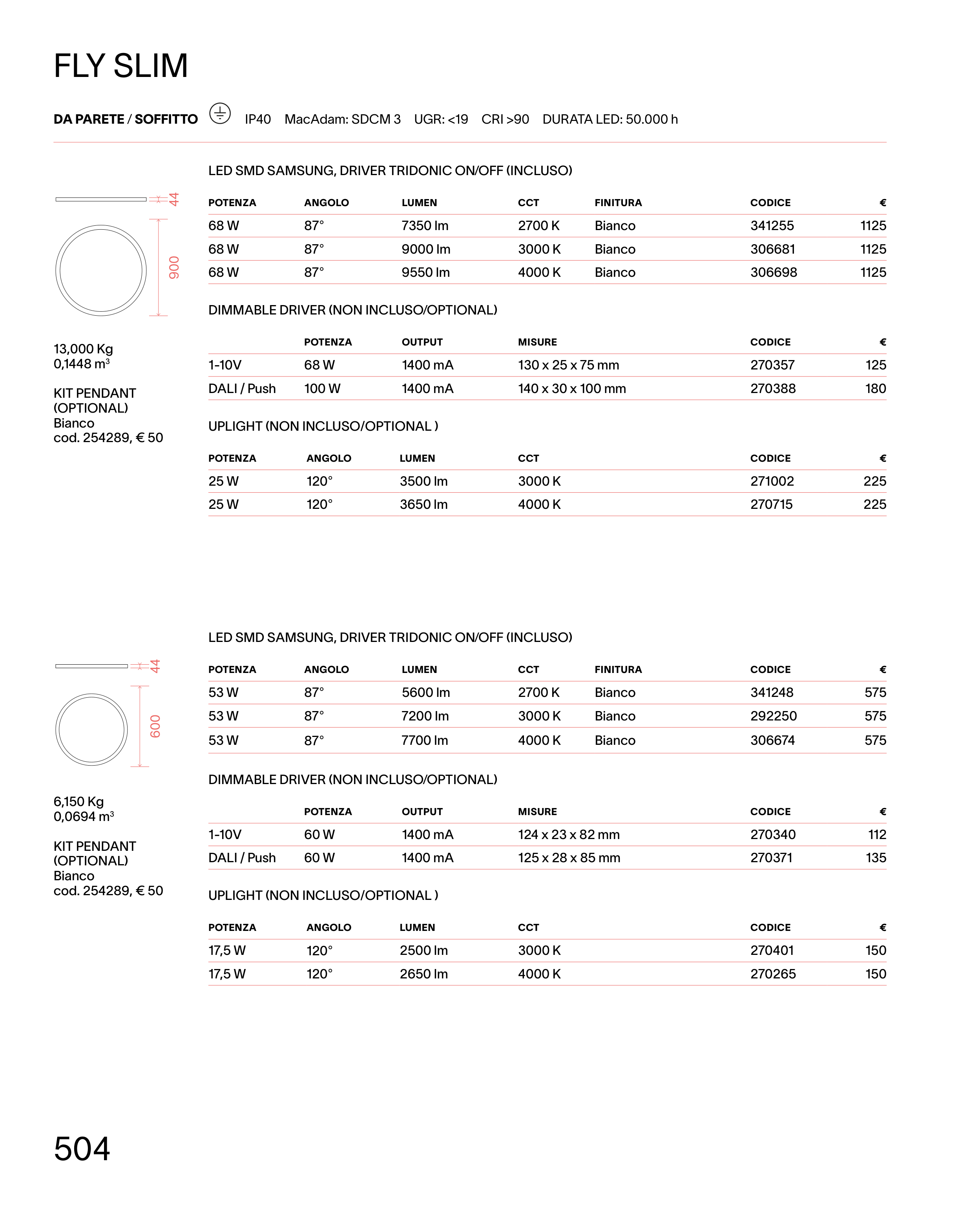 IP40 MacAdam: SDCM 3 UGR: <19 CRI >90 DURATA LED: 50.000 h