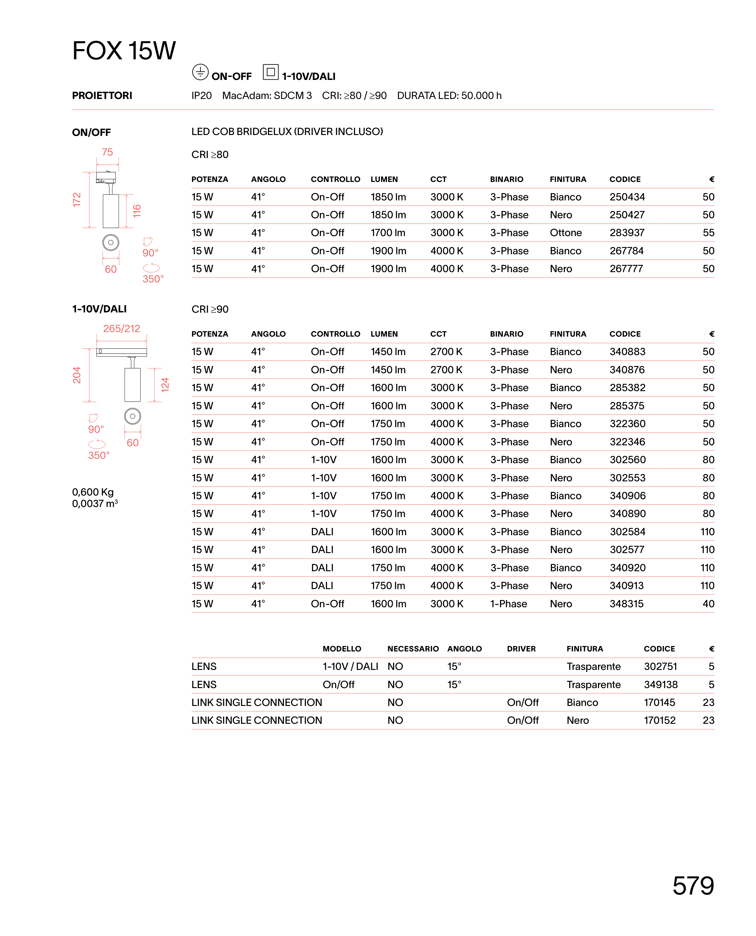 IP20 MacAdam: SDCM 3 CRI: ≥80 / ≥90 DURATA LED: 50.000 h