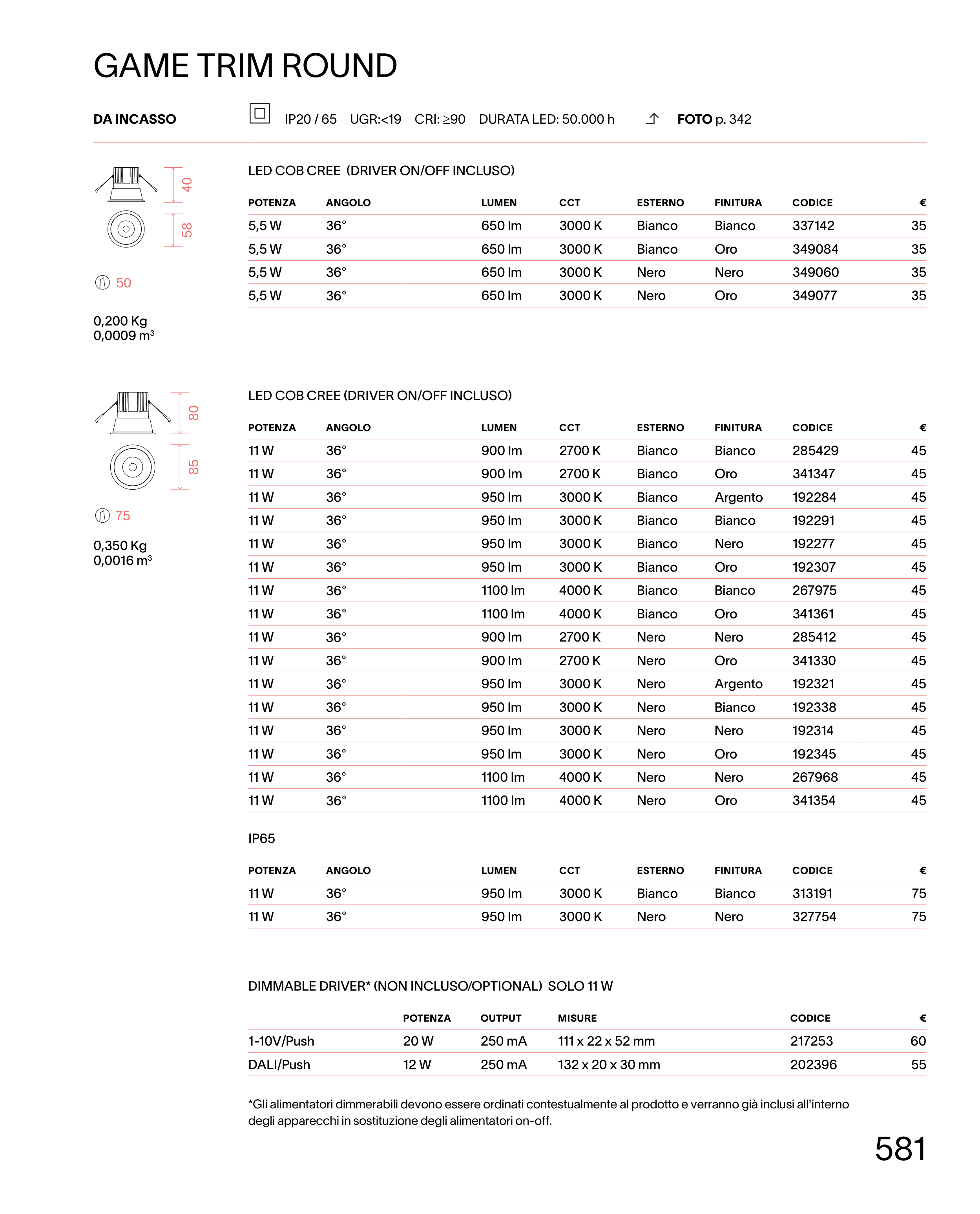 IP20 / 65 UGR:<19 CRI: ≥90 DURATA LED: 50.000 h