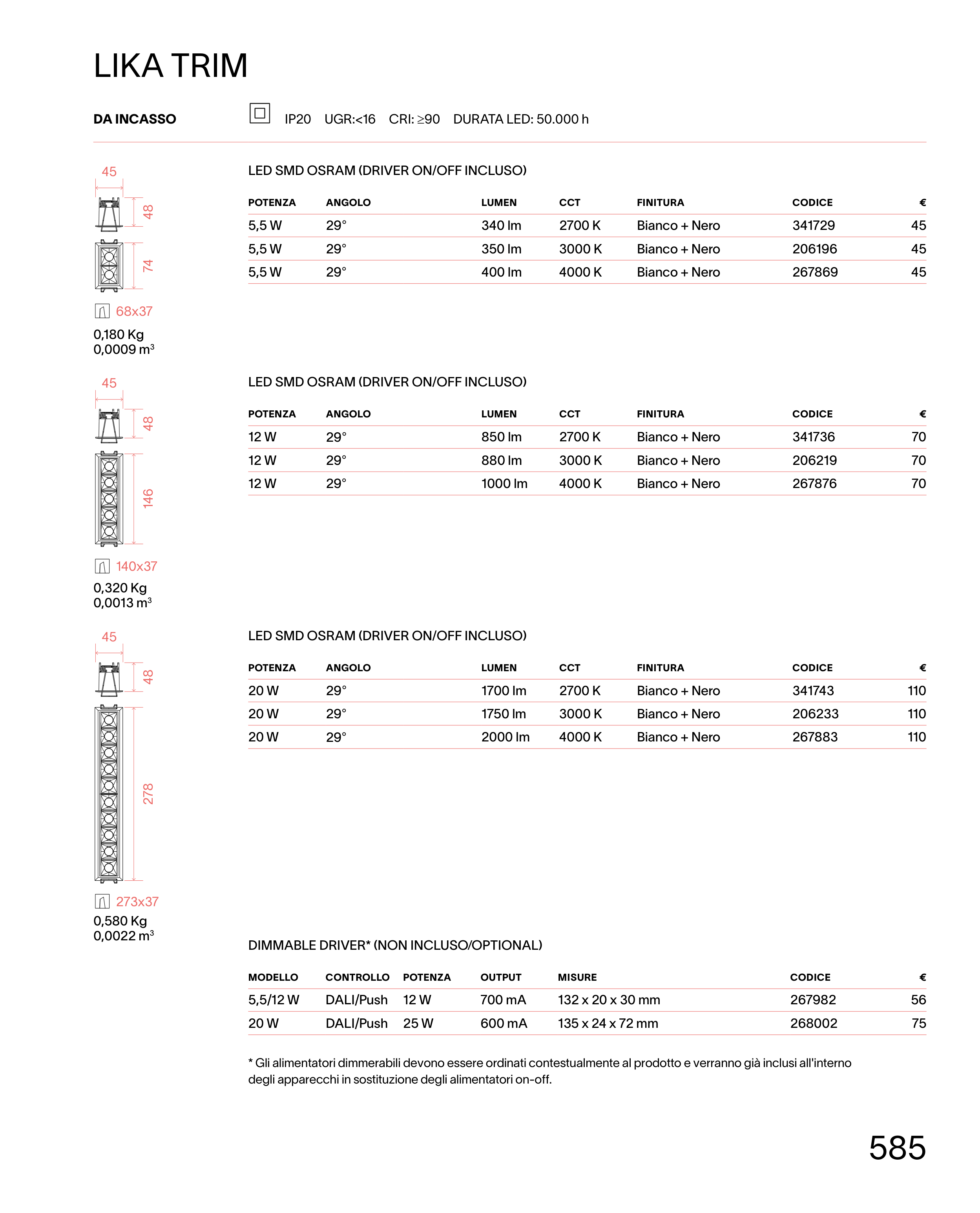 * Gli alimentatori dimmerabili devono essere ordinati contestualmente al prodotto e verranno già inclusi all'interno