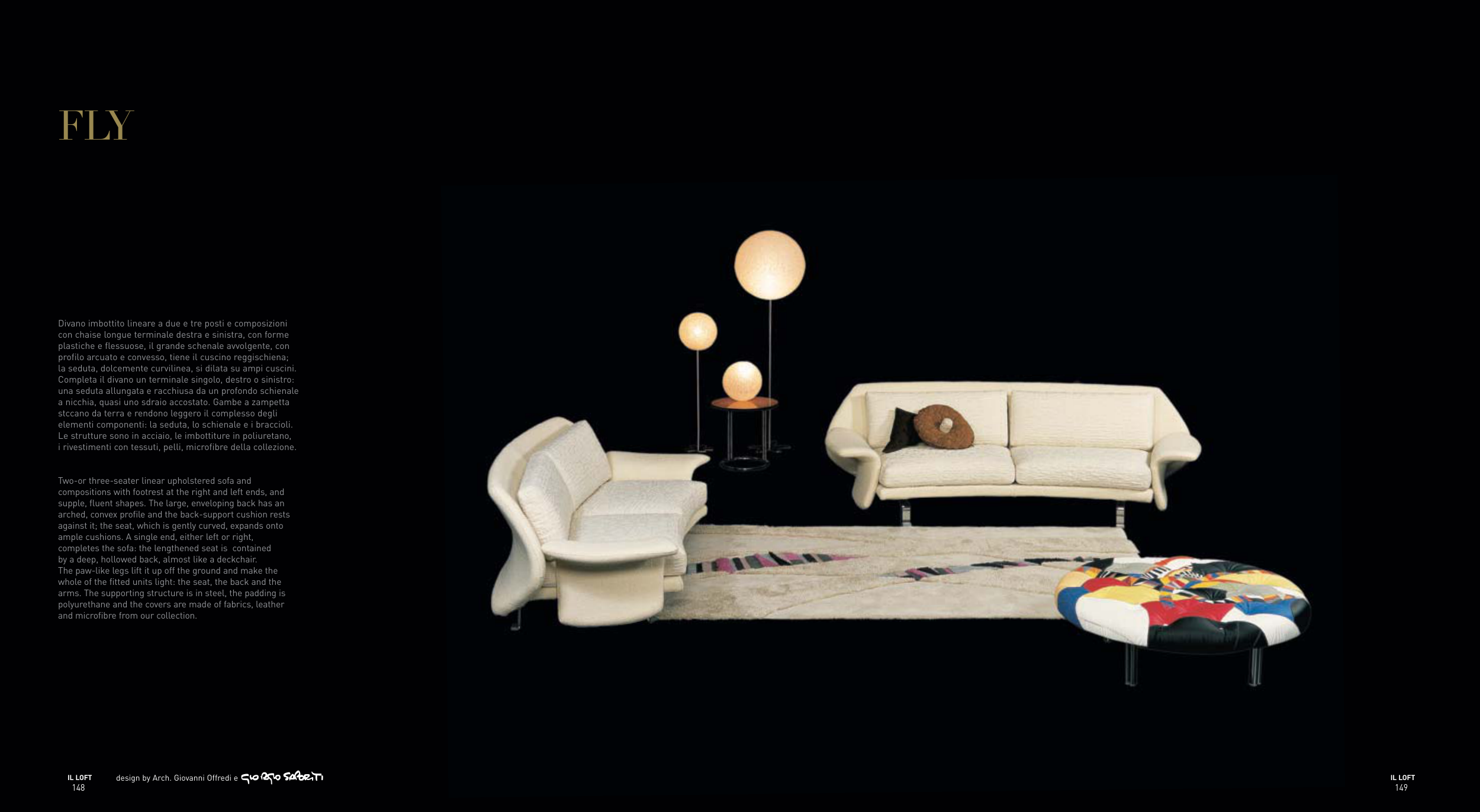 la seduta, dolcemente curvilinea, si dilata su ampi cuscini.
