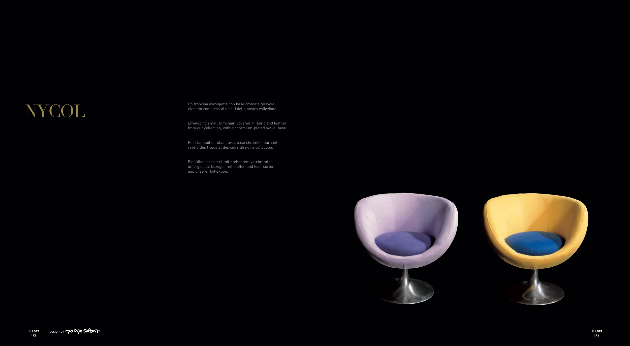 Poltroncina avvolgente con base cromata girevole
