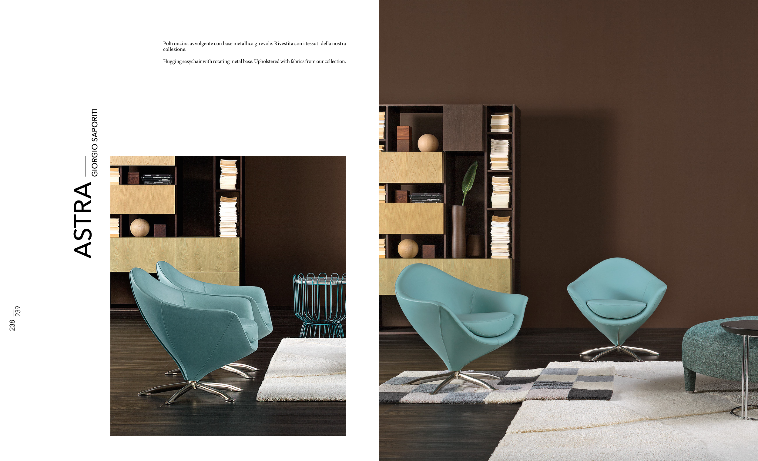 Poltroncina avvolgente con base metallica girevole. Rivestita con i tessuti della nostra