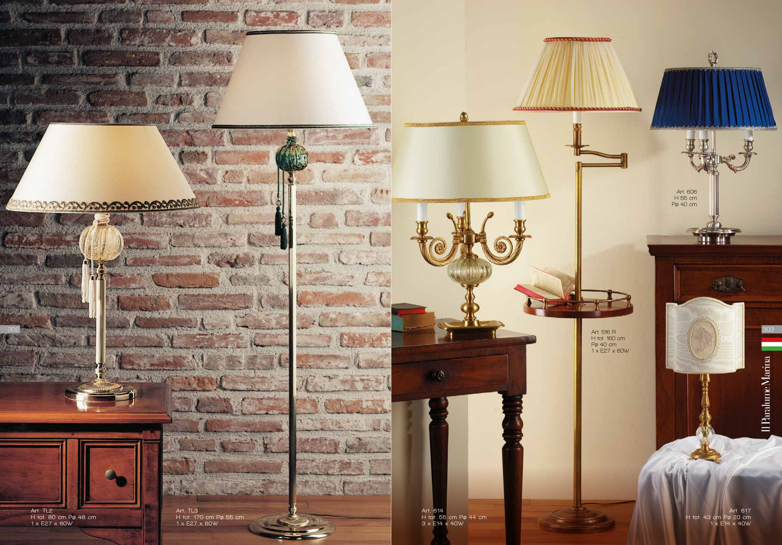 Art. 606 H 55 cm Pø 40 cm Art. TL3 H tot. 170 cm Pø 55 cm 1 x E27 x 60W Art. TL2 H tot. 80 cm Pø 48 cm 1 x E27 x 60W Art. 614 H tot. 55 cm Pø 44 cm 3 x E14 x 40W Art. 516 R H tot. 160 cm Pø 40 cm 1 x E27 x 60W Art. 617 H tot. 43 cm Pø 20 cm 1 x E14 x 40W 303 302